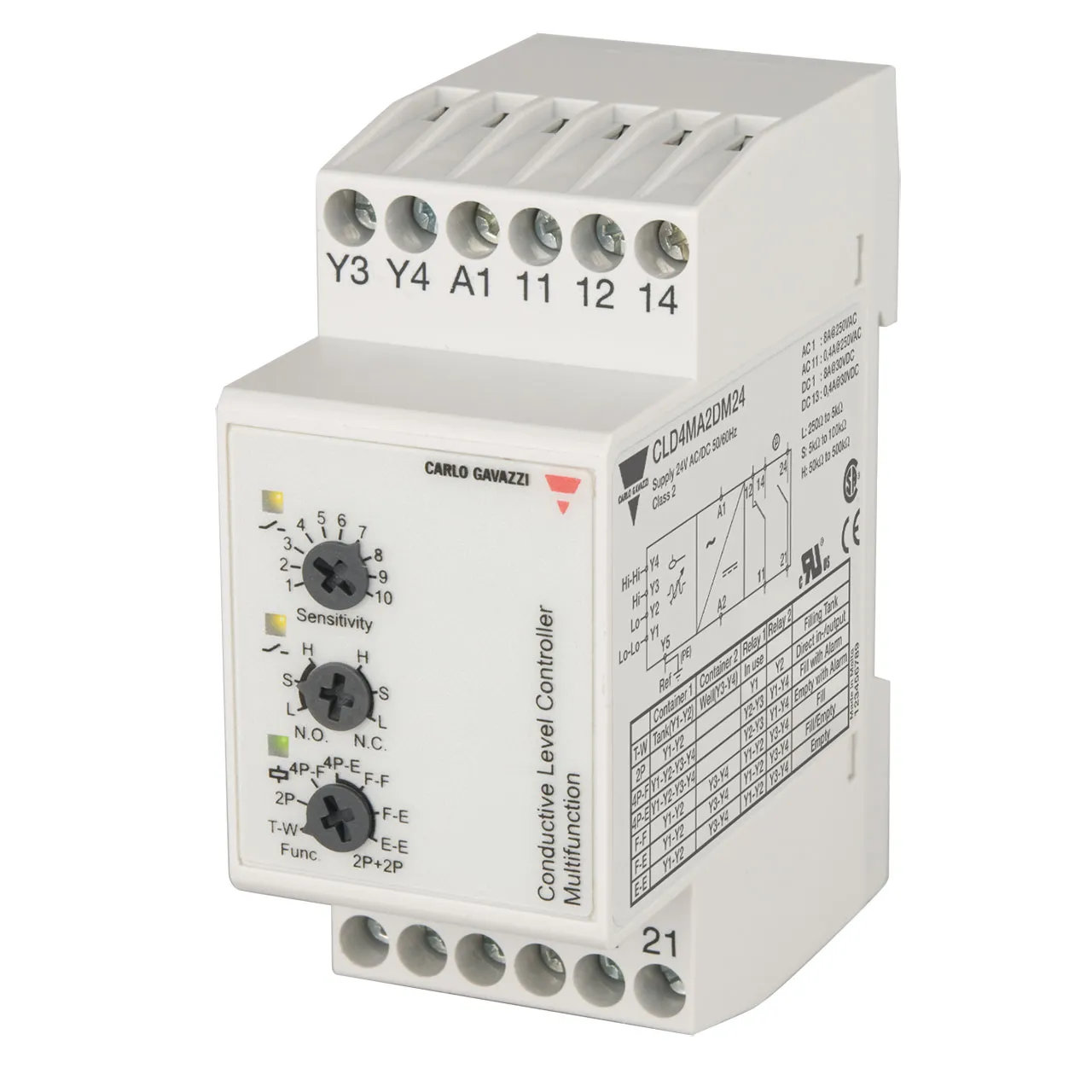 Conductive 2 to 4-PoInt Level Controller, DIN Rail Mount, FilIng-EmptyIng With Multi-Functions, Sensitivity 250 Ohm-500K Ohm, SPST + SPDT Relay Output, Supply Voltage 24VAC/DC, 35.5 x 81 x 60.2mm Housing, IP20