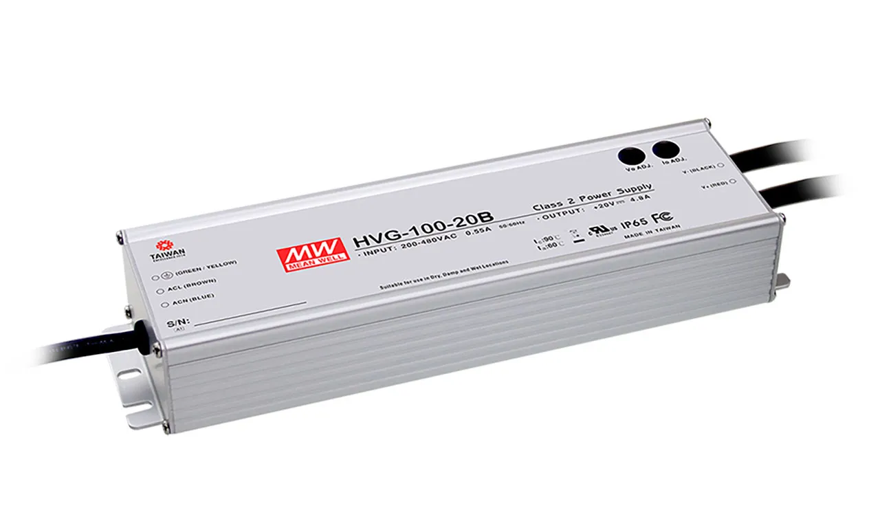 HVG-100 series is a 100W AC-DC LED driver featuring the dual mode constant voltage and constant current output. It operates from 180-528VAC and offers models with different rated voltage ranging between 15V and 54V. Thanks to the high efficiency up to 91% and with the fanless design, the entire series can operate with -40C to +90C case temperature under free air convection. The design of metal housing and IP65 ingress protection level allows this series to fit both indoor and outdoor applications. HVG-100 is equipped with various function options, such as dimming methodologies, so as to provide the optimal design flexibility for LED lighting systems.