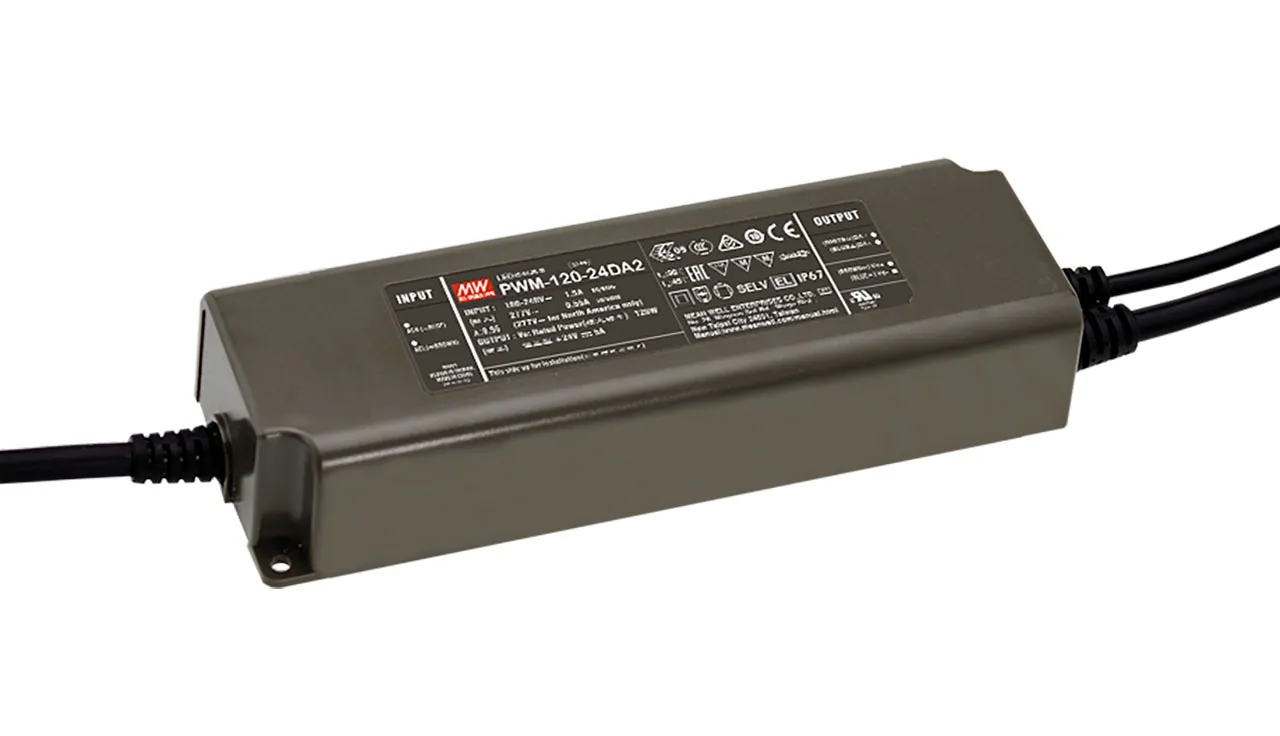 The PWM-120 series is a 120W AC/DC constant LED driver featuring the constant voltage mode with PWM style output, which is able to maintain the color temperature and the brightness homogeneity when driving all kinds of LED strips. The PWM-120 operates from 90-305VAC and offers different rated voltage ranging between 12V and 48V. Thanks to the efficiency up to 90.5%, with the fanless design, then entire series can operate with -40C to 90C case temperature under free air convection. The entire series is rated with IP67 ingress protection level and is suitable to work for dry, damp or wet locations. PWM-120 is equipped with dimming functions that varies the duty cycle of the output, providing great flexibility for LED strip applications.