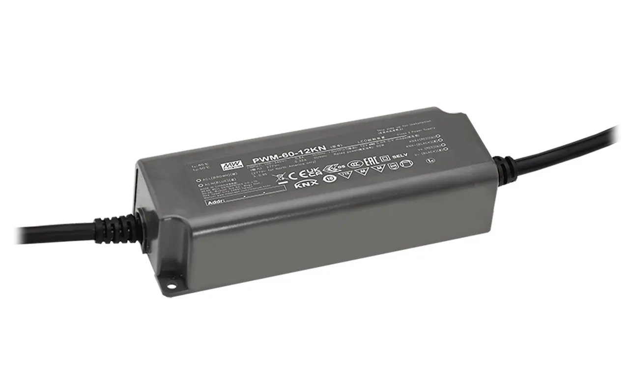 The PWM KN series is a 60W AC/DC constant LED driver featuring the constant voltage mode with PWM style output, which is able to maintain the color temperature and the brightness homogeneity when driving all kinds of LED strips. The built-in KNX interface is to avoid using the complicated KNX-DALI gateway.