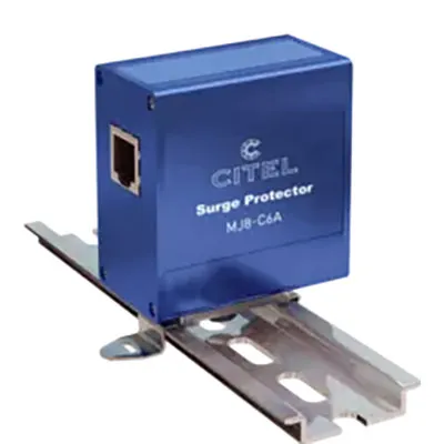 This surge suppression device (SPD) is designed for CAT5, CAT5E and CAT6 Ethernet networks and is compatible with all 10/100/1000 Mbps configurations. It features Hybrid GDT and diode technology for surge current rating up to 16 kA IMAX. It offers bi-directional protection and has shielded connectors. It mounts on a DIN rail but supports flange mounting, and it has screw lugs. This SPD comes with a 10-year warranty.Specifications