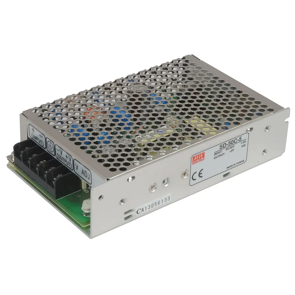 The Mean Well SD families of enclosed DC-to-DC converters are known for their reliability and low cost. The physical ruggedness is complemented by the many electrical protections; short-circuit, overload with auto-recovery, and over-voltage to 165% of rated output. These converters offer wide 2:1 input voltage ranges of 9-18VDC and 36-72VDC. The input-to-output isolation is 500VDC and the isolation resistance is 100Mohm at 500VDC. The highly-efficient, low-temperature design provides full power from 0°C to 40°C, with derating to '10°C and +60°C. The line and load regulation are both 0.5% maximum. The Mean Well SD series complies with EMC standards EN55022 class B and EN61000-4-2/3/4/6/8.