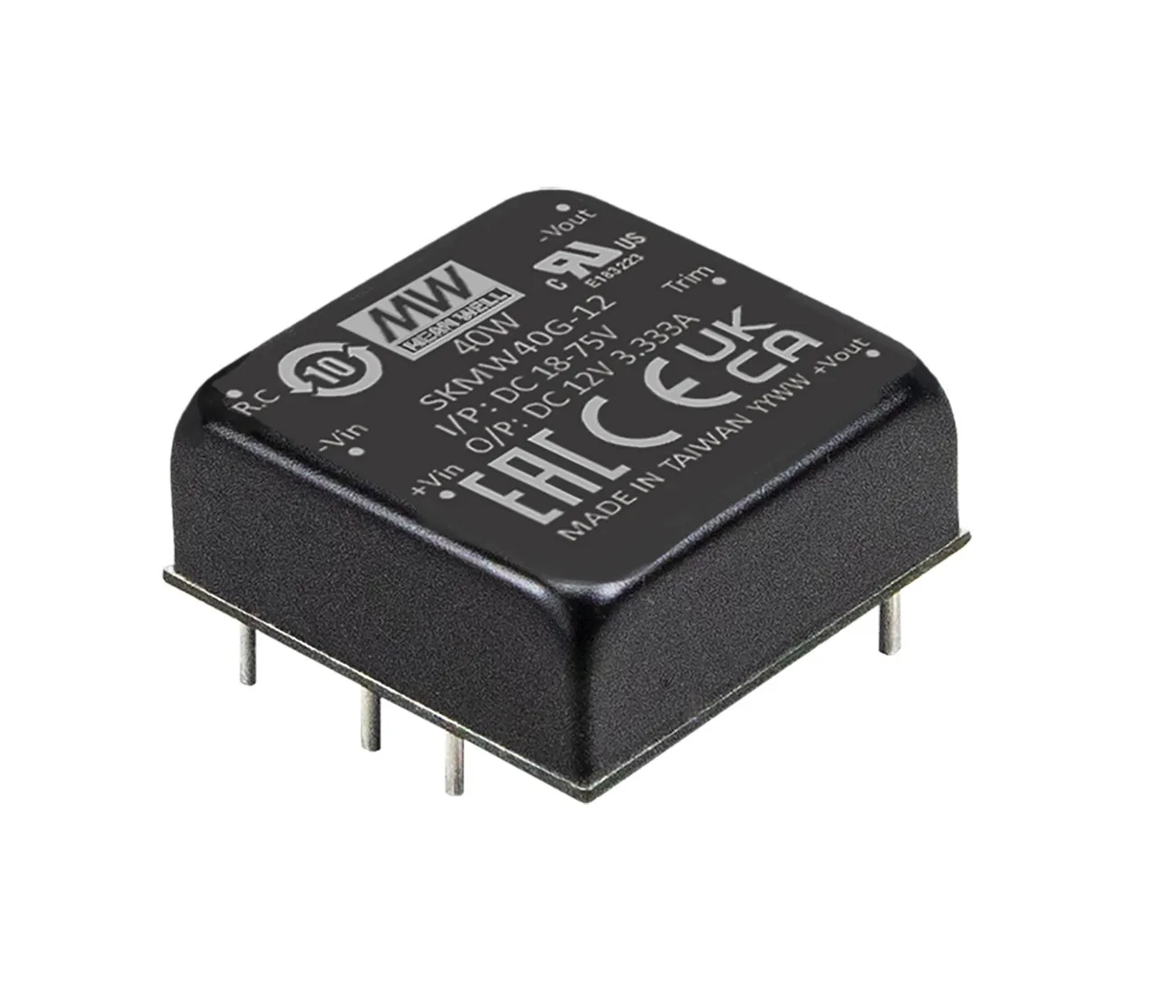 SKMW40 and DKMW40 series are 40W isolated and regulated module type DC-DC converter with DIP 1"x1" package. It features international standard pins, a high efficiency up to 91%, wide working temperature range -40 to +80C, 2KV I/P-O/P isolation voltage, compliance to BS EN/EN55032 radiated Class A/B with additional components, continuous-mode short circuit, overload, input under voltage protection, etc. The models account for different input voltage 9-36V and 18-75V 4:1 ultrawide input range, and various output voltage, 3.3V/5V/12V/15V/24V for single output and ±12V/±15V for dual outputs, which are suitable for all kinds of systems such as industrial control, telecommunication field, distributed power architecture, and more.