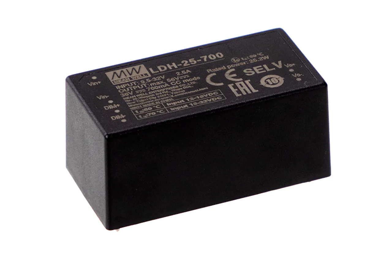 The LDH-25 series is a 25W DC/DC LED driver featuring constant current output. The LDH-25 operates from 9.5-32VDC and offers models with different rated current ranging between 250mA and 700mA. Thanks to the efficiency up to 95.5%, the 94V-0 flame retardant plastic case, and the fully potted silicone, enhance the heat dissipation allowing this series to fit solar LED street lights. In addition, LDH-25 is equipped with various function options, such as dimming methodologies, so as to provide the optimal design flexibility for LED lighting systems.