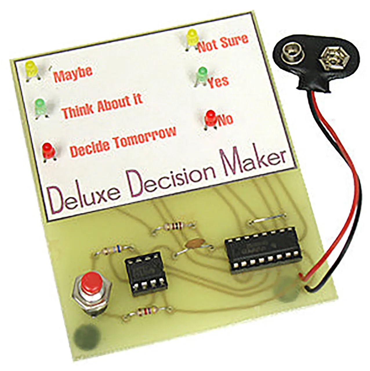 Let this colorful "electronic brain" make all of your important decisions for you. Displays the results to your questions using a variety of bright colored LEDs.This kit uses a 2 IC circuit and a label you glue onto the PC board. Simply press the start button and all of the LEDs begin to flash. As soon as you release the button, one LED will glow to indicate the "electronic brain's" decision. Lots of fun to use and easy to build. Operates from one 9V battery (not included). Size of PC board: 3" x 3-5/8". Complete with all parts, label, PC board and instructions. Skill Level 2.