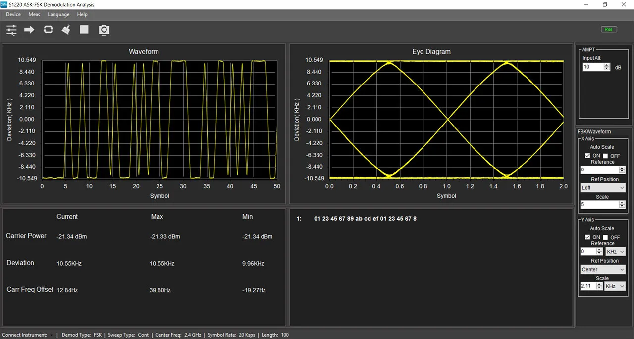 Customers incorporating wireless technologies into Internet of Things designs frequently use the popular standards Amplitude Shift Keying (ASK) and Frequency Shift Keying (FSK). The SA1220 Demodulation Analysis Software gives our customers an affordable tool set for examining, visualizing, and analyzing ASK and FSK signals when paired with a RIGOL DSA832E, DSA832, or DSA875 spectrum analyzer. Engineers can use the S1220 to see baseband data, capture and compare RF signal properties, decode real-time ASK and FSK RF signals, examine noise range tradeoffs, and find timing faults.
