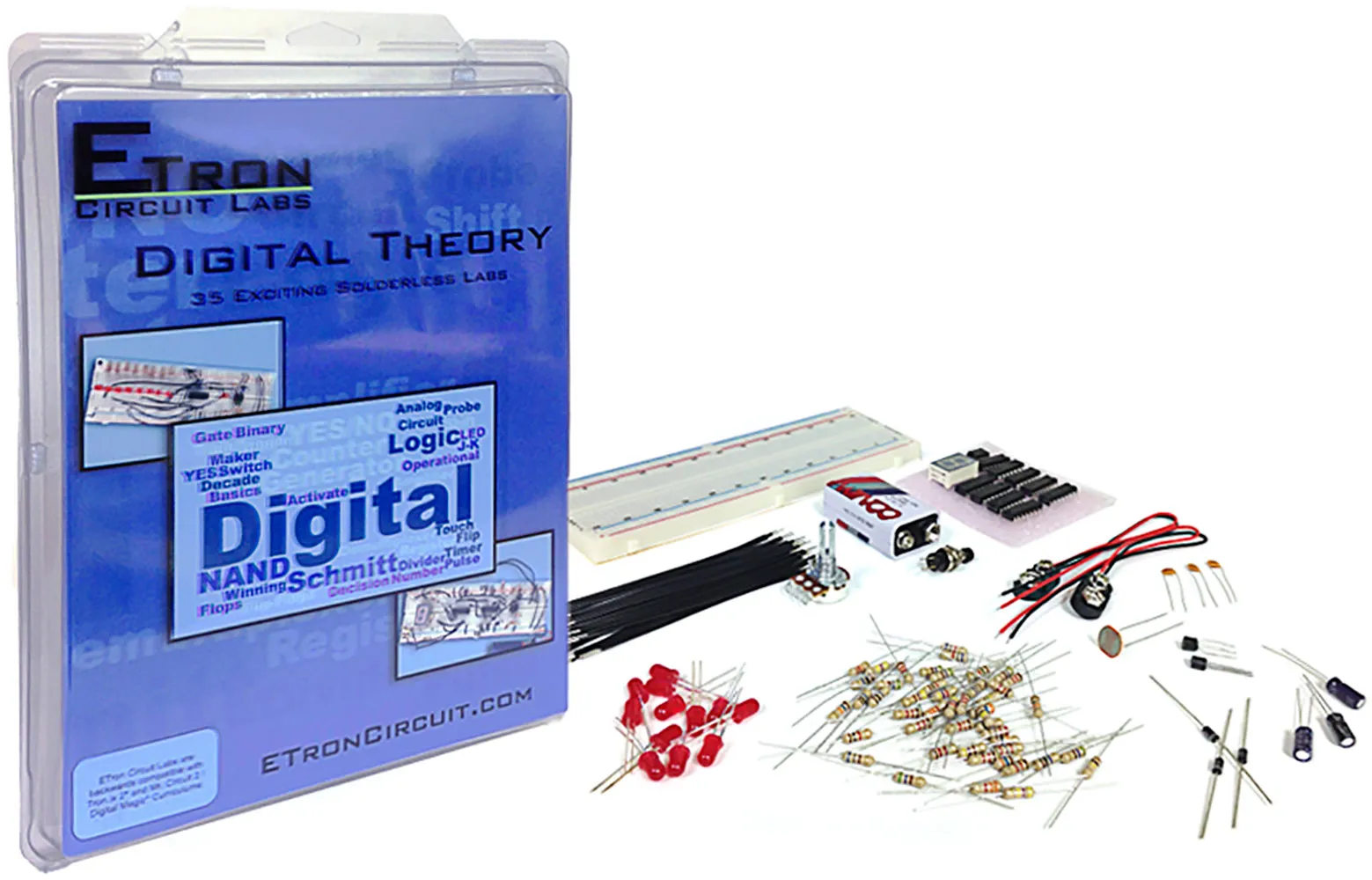 Digital Theory by ETron Circuit Labs is Electronic Education Curriculum designed for the 21st century electronics student. It features 35 exciting Labs, and Digital Theory picks up where The Basics leaves off teaching the necessary Digital Theory needed to be competitive in a technology based job market.Digital Theory is fully backwards compatible with Tron.ix 2 and Mr. Circuit 2/Digital Magic courses.