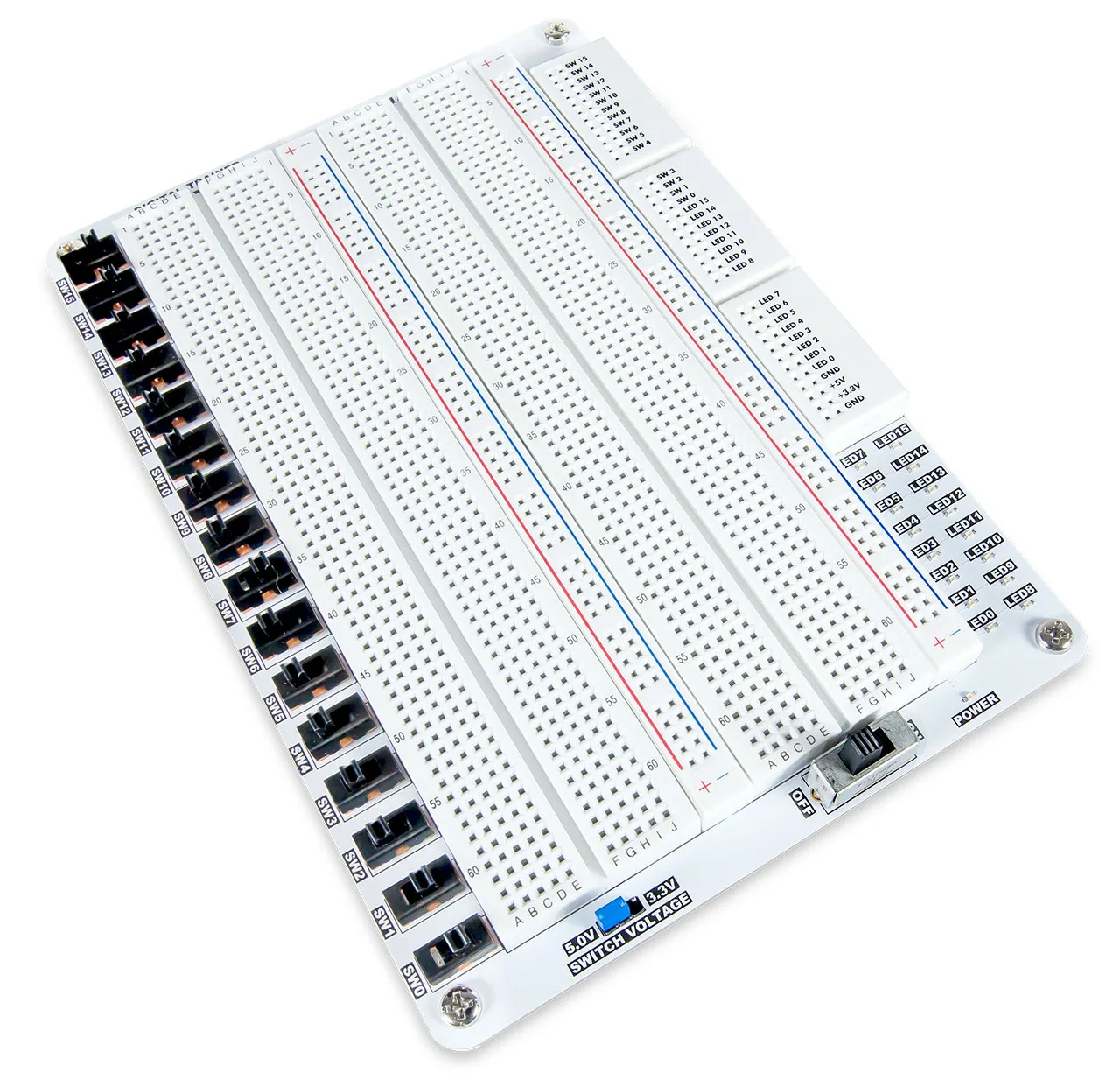 The bulk of the Digital Trainer Canvas consists of 2 regular sized breadboards and two power rails. At the top of the board, three small breadboards contain the access pins for the power supplies, switches, and LEDs. Sixteen switches and LEDs are integrated into the canvas. The power supply access pins can be switched ON / OFF via the power supply switch and the status is indicated by the POWER indicator LED. The Digital Trainer Canvas is used with or without the Analog Discovery Studio.