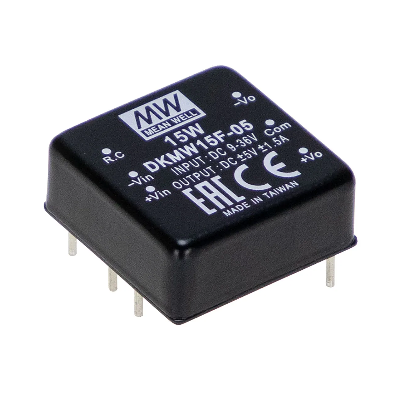 DMKW06 series is a 15-watt isolated and regulated module type DC-DC converter with DIP 1"x1" package. This model has an ultrawide input voltage range of 9V to 36V, 24V nominal, and dual output of ±5V and is suitable for all kinds of systems such as industrial control, telecommunication field, distributed power architecture, and so on.