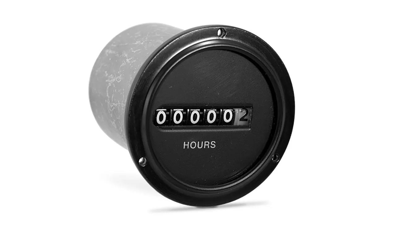 Electromechanical hour meter, 115 VAC, 60 Hz, hours and tenths, 3-hole cup mount, 6" wire leads, non-reset.