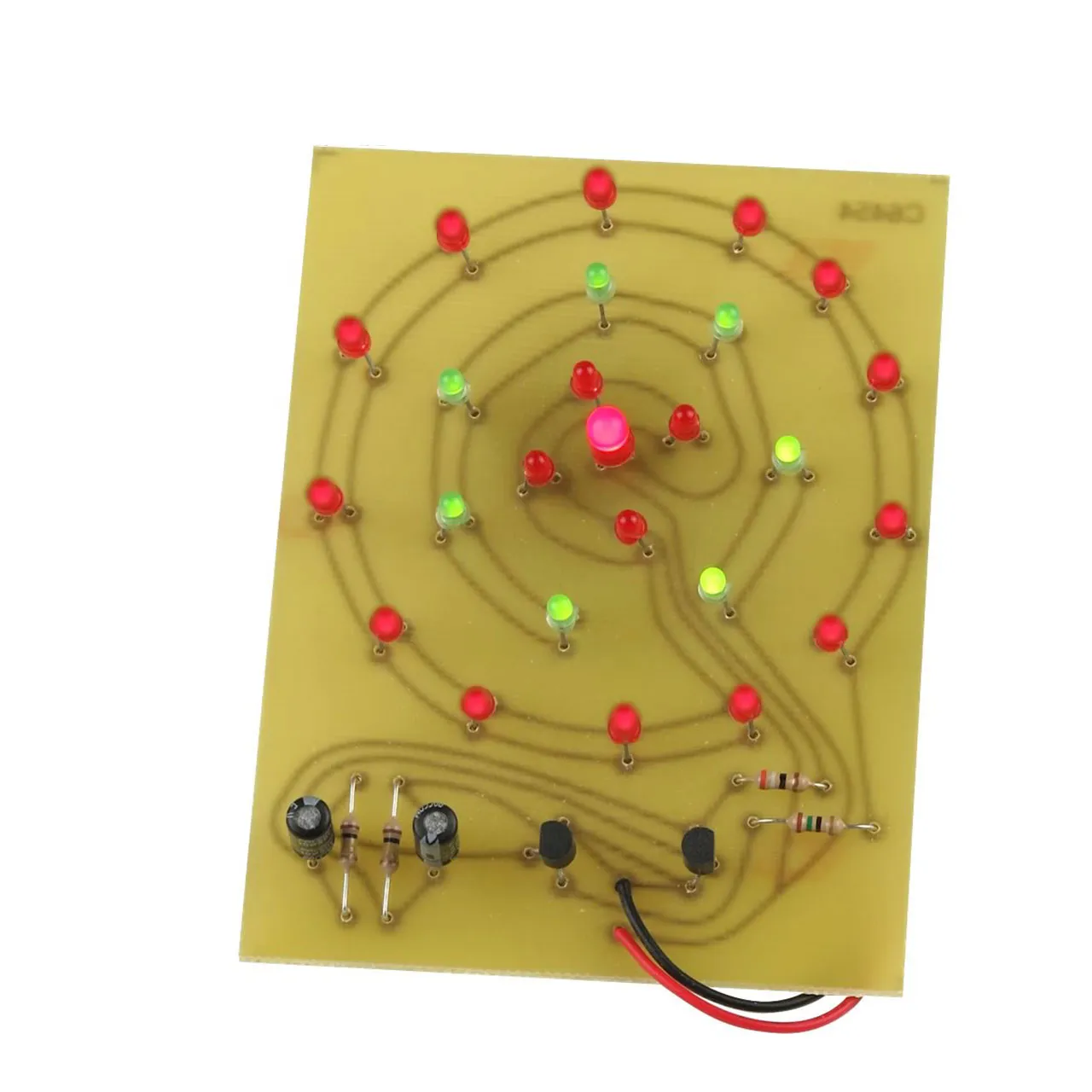 Exciting kit electronically creates an exploding "Firework" like display. Kit features 17 micro red LEDs, 7 green mini LEDs and 1 jumbo red LED. The circuit uses a 2 transistor multi-vibrator that alternates between the "rings" of LEDs, which cause a display like "sky rocket" type fireworks. Great attention getter in a darkened room. Attractive and makes an interesting intermediate project. Size of board: 3.875" x 3". Operates from one 9V battery (not included). Complete with all parts, PC board and instructions. Skill Level 2.