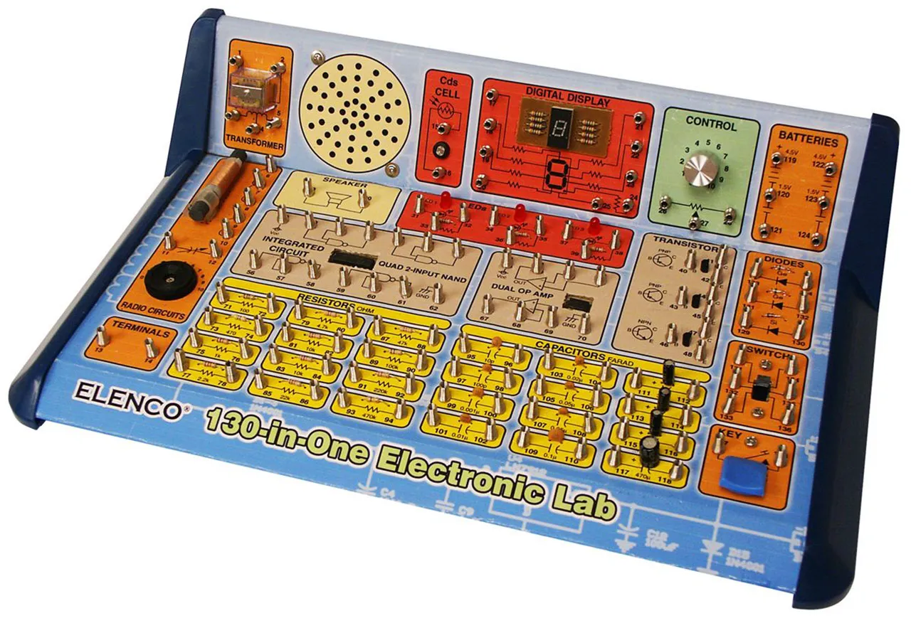 Start a great hobby in electronics. Spring coil connections make it safe and easy for anyone to use. It includes a detailed, step-by-step illustrated manual for easy construction. Comes with a built-in speaker, a 7-segment LED display, two integrated circuits, and rotary controls. Everything you need to build an AM broadcast station, an electronic organ, strobe lights, a timer, logic circuits, and many more!