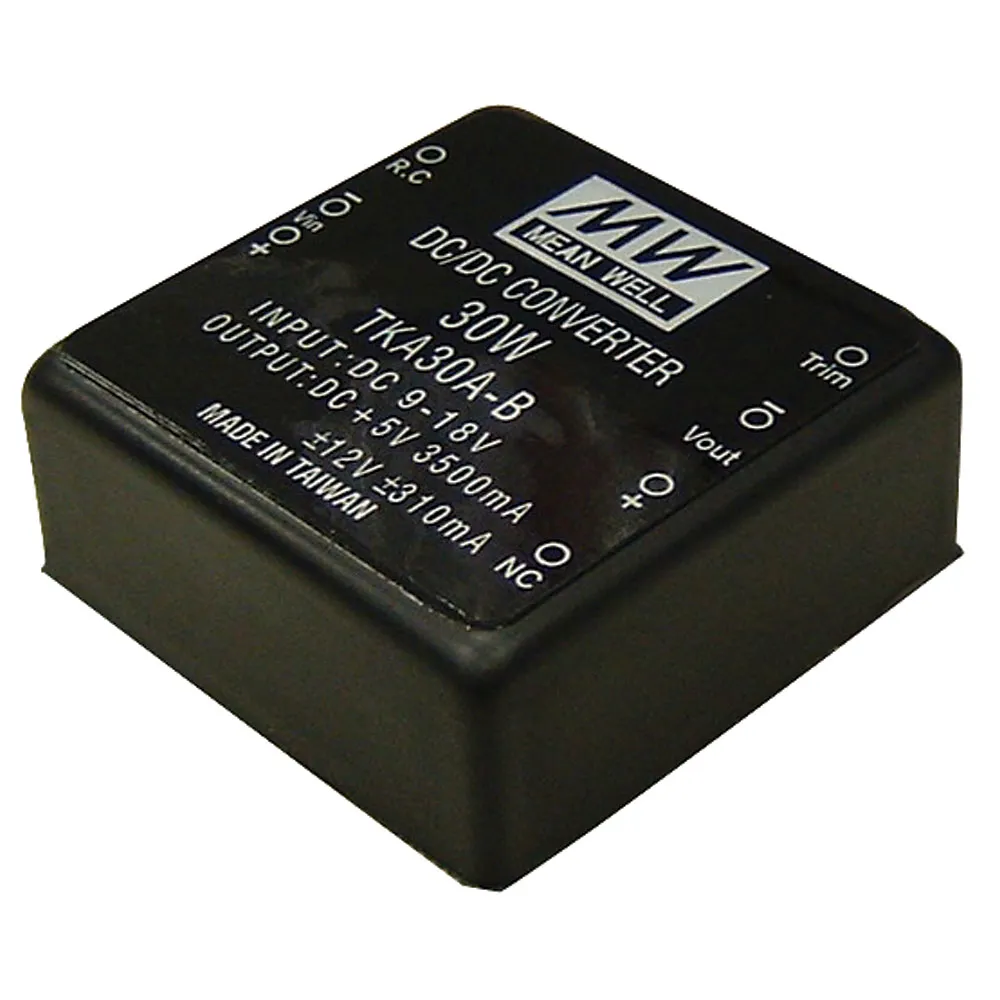 The Mean Well TKA30 family of regulated 30-watt DC-to-DC converters include popular dual and triple-output configurations packaged in six-sided, shielded metal cases. Line and load regulation are both an outstanding 0.2%. Load regulation applies for a load change of 10% to full load for both dual and triple-outputs. The industry-standard package supports full power with free-air convection over the ambient temperature range of ?40°C to 71°C. Performance features include a wide input voltage range of 2:1 and the use of a pi-network input filter for low noise operation. The input-to-output isolation is an impressive 1000VDC, with I/O isolation resistance of 1000MOHM. Short-circuit and over-voltage protection is included. For ease of use, the TKA30 units require no external components and provide both voltage trim and remote ON/OFF capability.