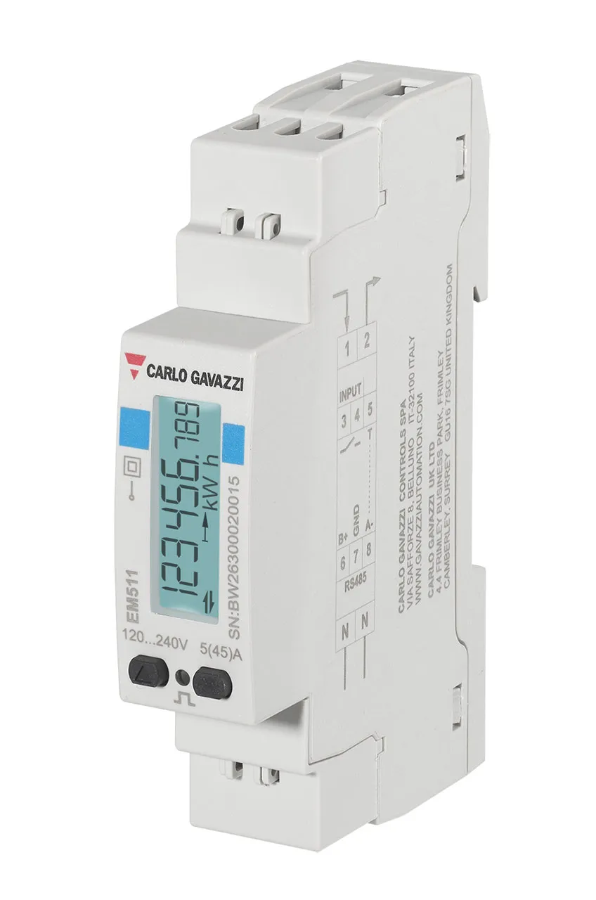 Energy analyzer for 1-phase systems up to 240 V L-N and current up to 45A. 0.5% accuracy. 1 digital input + 1 digital output (pulse or alarm). MID Bidirectional