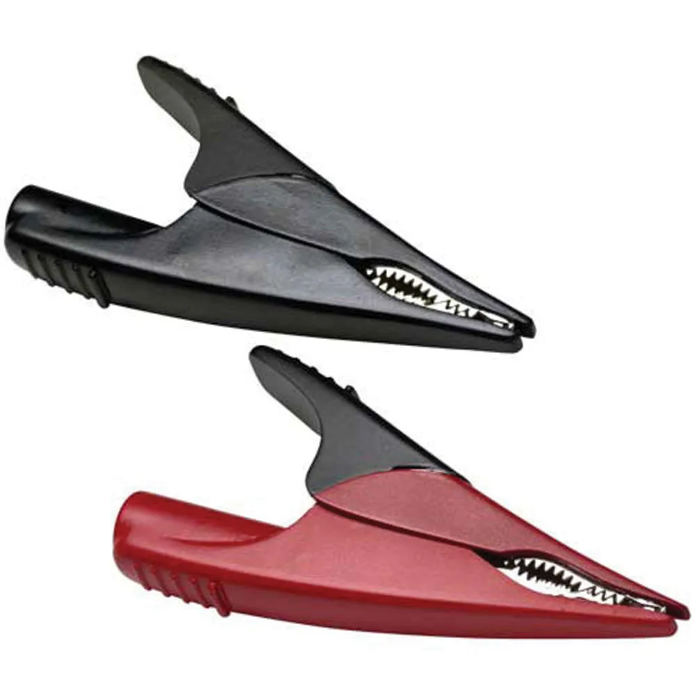 One pair (red, black) of large alligator clips with nickel-plated steel jaws