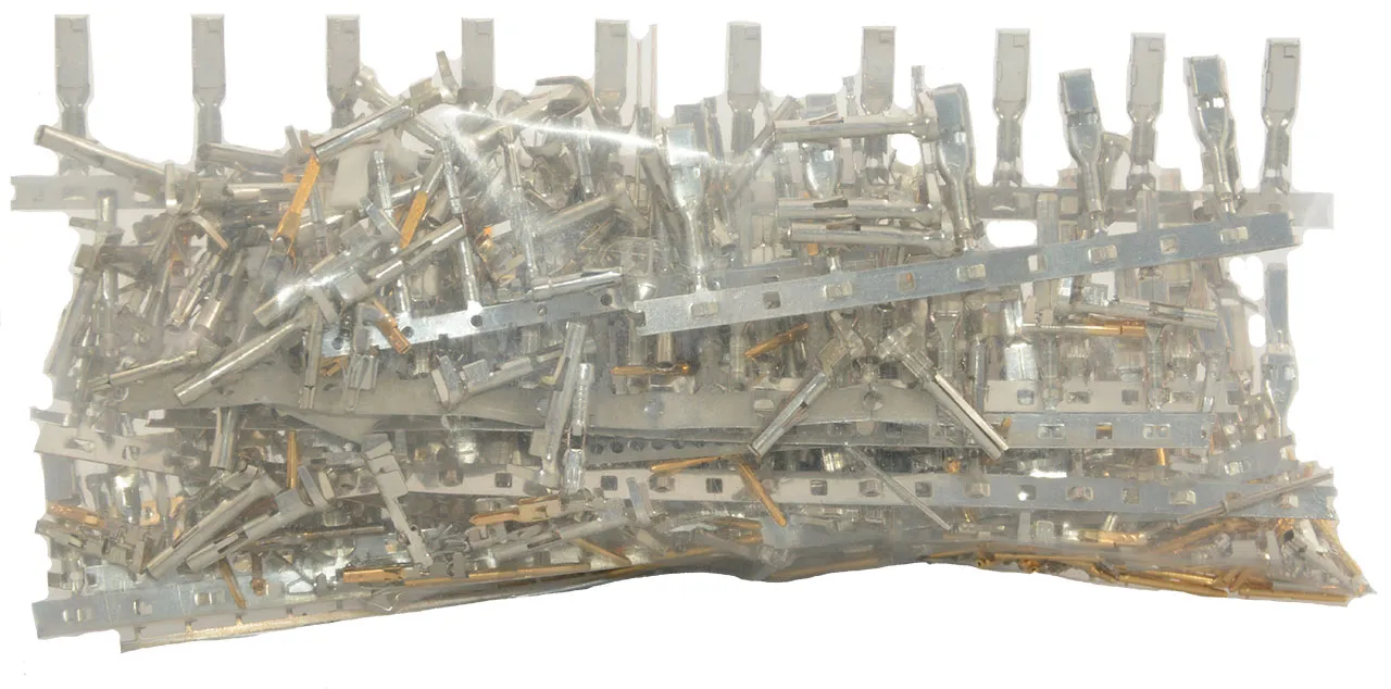 300 Piece grab bag of connector contacts, pins, both male and female, in assorted gauges (12-28 AWG).
