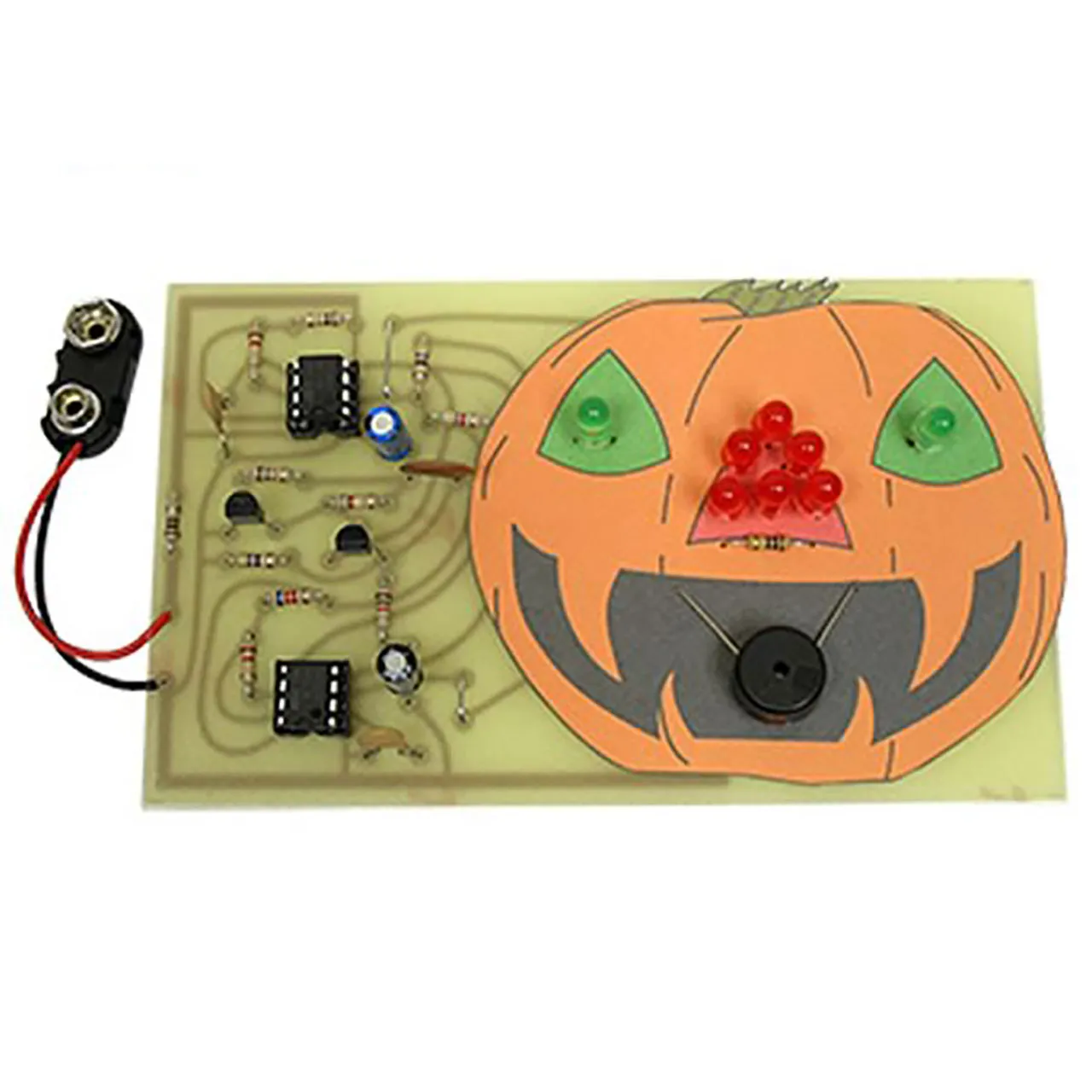 Here is the perfect kit to spice up your Halloween. In addition to alternately flashing its green LED eyes with its red LED nose, it also produces an eerie, spooky electronic sound from its piezo mouth. The kit operates from one 9V battery (not included) and uses a 2 IC circuit and full color "pumpkin label" for you to glue on to the PC board. Size of PC board: 5" x 3". Complete with all parts, label, PC board and instructions. Skill Level 2.
