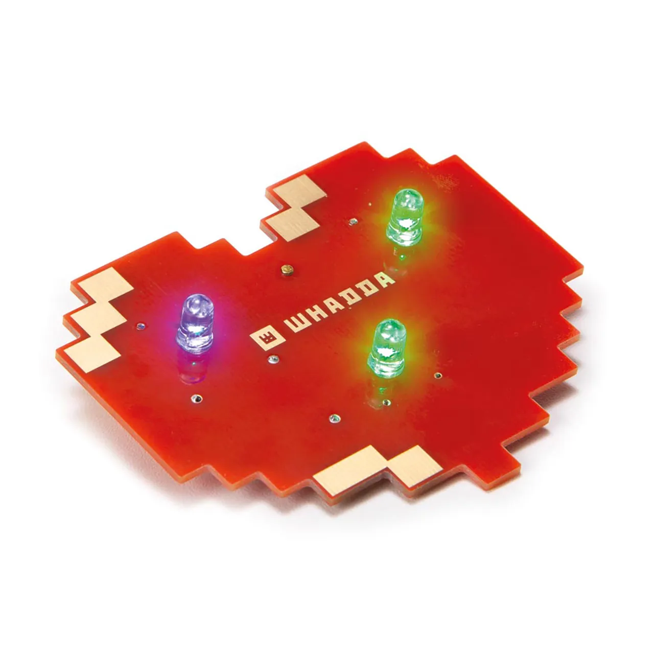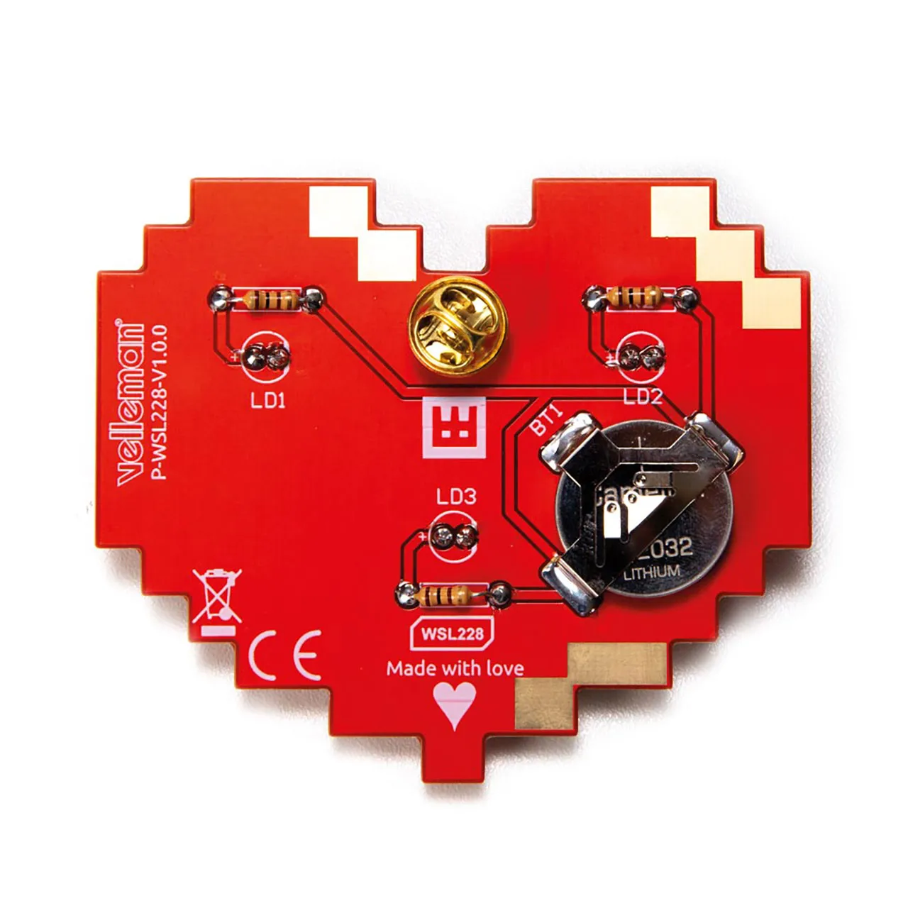 This heart-shaped soldering kit is perfect for STEM classes and workshops. The kit includes a red circuit board with a gold finish, three RGB blinking LEDs, and a badge pin for easy attachment. It ha