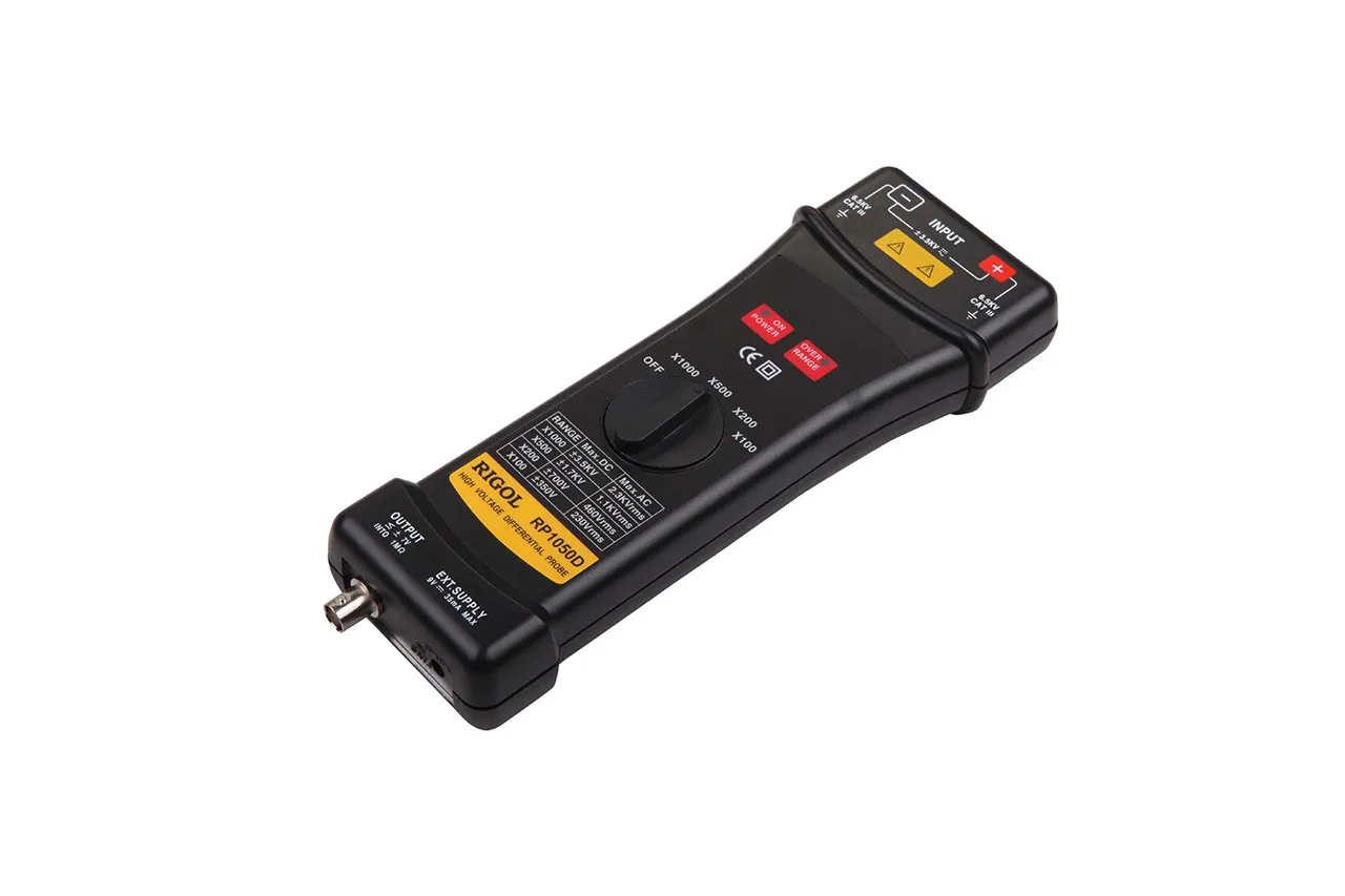 RP1000D series high voltage differential probe is applicable to general purpose oscilloscope and the labeled attenuation ratios are those when the input impedance of the oscilloscope is 1MΩ. The attenuation ratios will double when the input impedance of the oscilloscope is 50Ω.