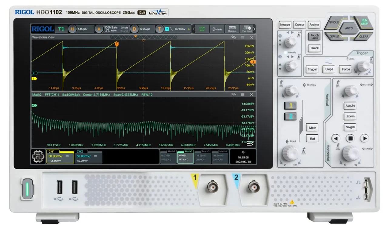 The DHO1000 Series provides improved signal integrity and value with our latest oscilloscope technology. Rigol's UltraVision III platform combined with a new ASIC chip design that provides true 12-bit samples makes the DHO1000 a great solution for benchtop applications where noise and accuracy are paramount. With bandwidths from 70 MHz to 200 MHz, these 2 and 4 channel oscilloscopes have our best signal visualization capabilities. Combine 50-100 Million points of memory, our new Ultra Acquire burst capture mode, and precision measurements for incredible signal fidelity value. The DHO1000 Series is a powerful entry level solution for engineers looking for next generation signal quality and value.