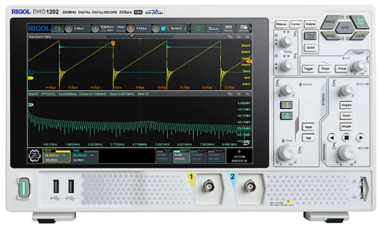 The DHO1000 Series provides improved signal integrity and value with our latest oscilloscope technology. Rigol's UltraVision III platform combined with a new ASIC chip design that provides true 12-bit samples makes the DHO1000 a great solution for benchtop applications where noise and accuracy are paramount. With bandwidths from 70 MHz to 200 MHz, these 2 and 4 channel oscilloscopes have our best signal visualization capabilities. Combine 50-100 Million points of memory, our new Ultra Acquire burst capture mode, and precision measurements for incredible signal fidelity value. The DHO1000 Series is a powerful entry level solution for engineers looking for next generation signal quality and value.