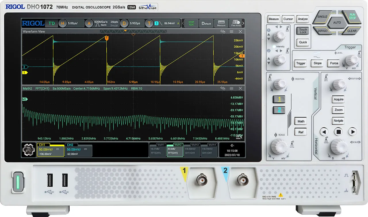 The DHO1000 Series provides improved signal integrity and value with our latest oscilloscope technology. Rigol's UltraVision III platform combined with a new ASIC chip design that provides true 12-bit samples makes the DHO1000 a great solution for benchtop applications where noise and accuracy are paramount. With bandwidths from 70 MHz to 200 MHz, these 2 and 4 channel oscilloscopes have our best signal visualization capabilities. Combine 50-100 Million points of memory, our new Ultra Acquire burst capture mode, and precision measurements for incredible signal fidelity value. The DHO1000 Series is a powerful entry level solution for engineers looking for next generation signal quality and value.