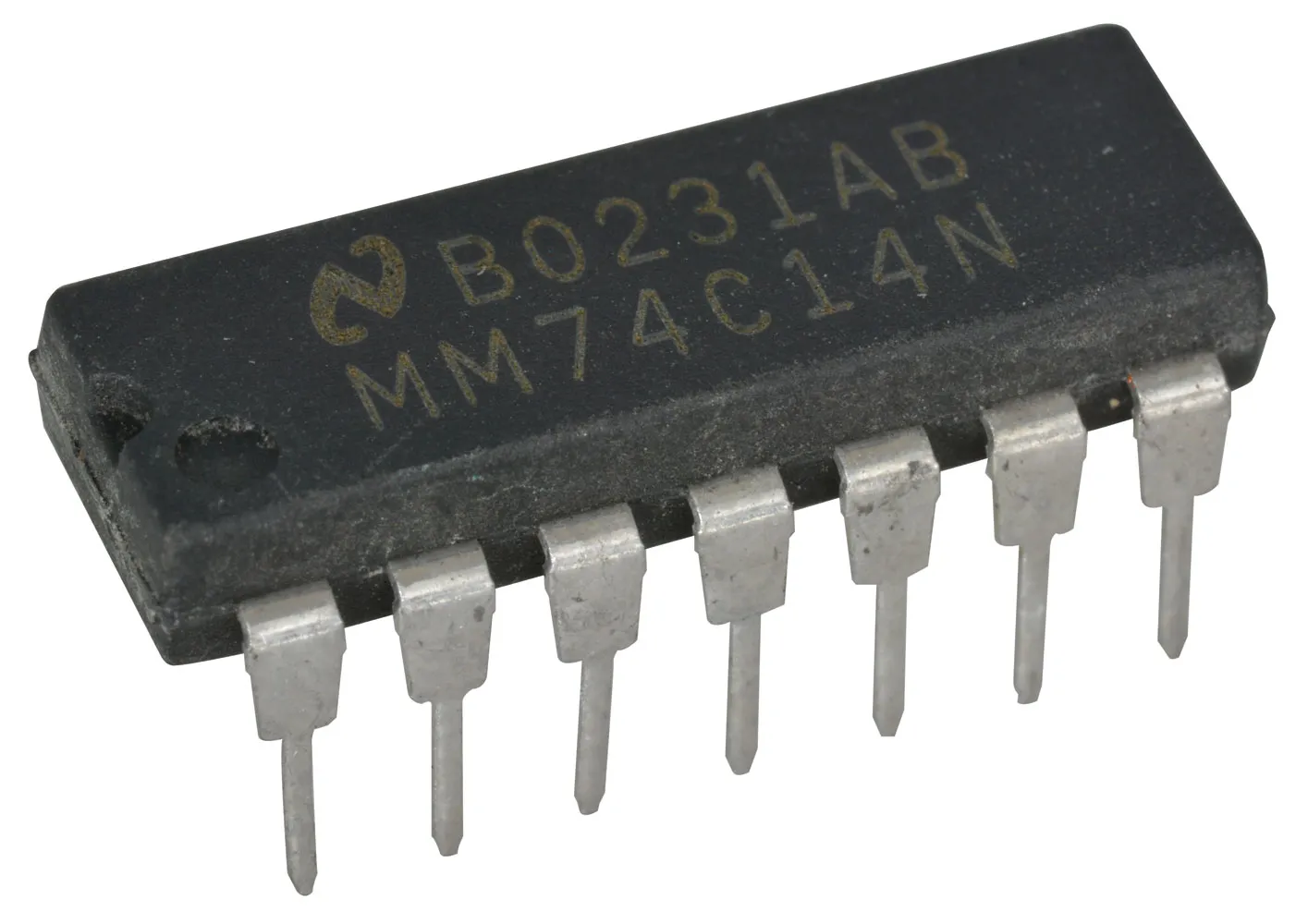 The MM74C14 Hex Schmitt Trigger is a monolithic complementary MOS (CMOS) integrated circuit constructed with N- and P-channel enhancement transistors. The positive and negative going threshold voltages VT+ and VT-, show low variation with respect to temperature (typ. 0.0005V/°C at VCC = 10V), and hysteresis, is guaranteed. All inputs are protected from damage due to static discharge by diode clamps to VCC and GND.Features