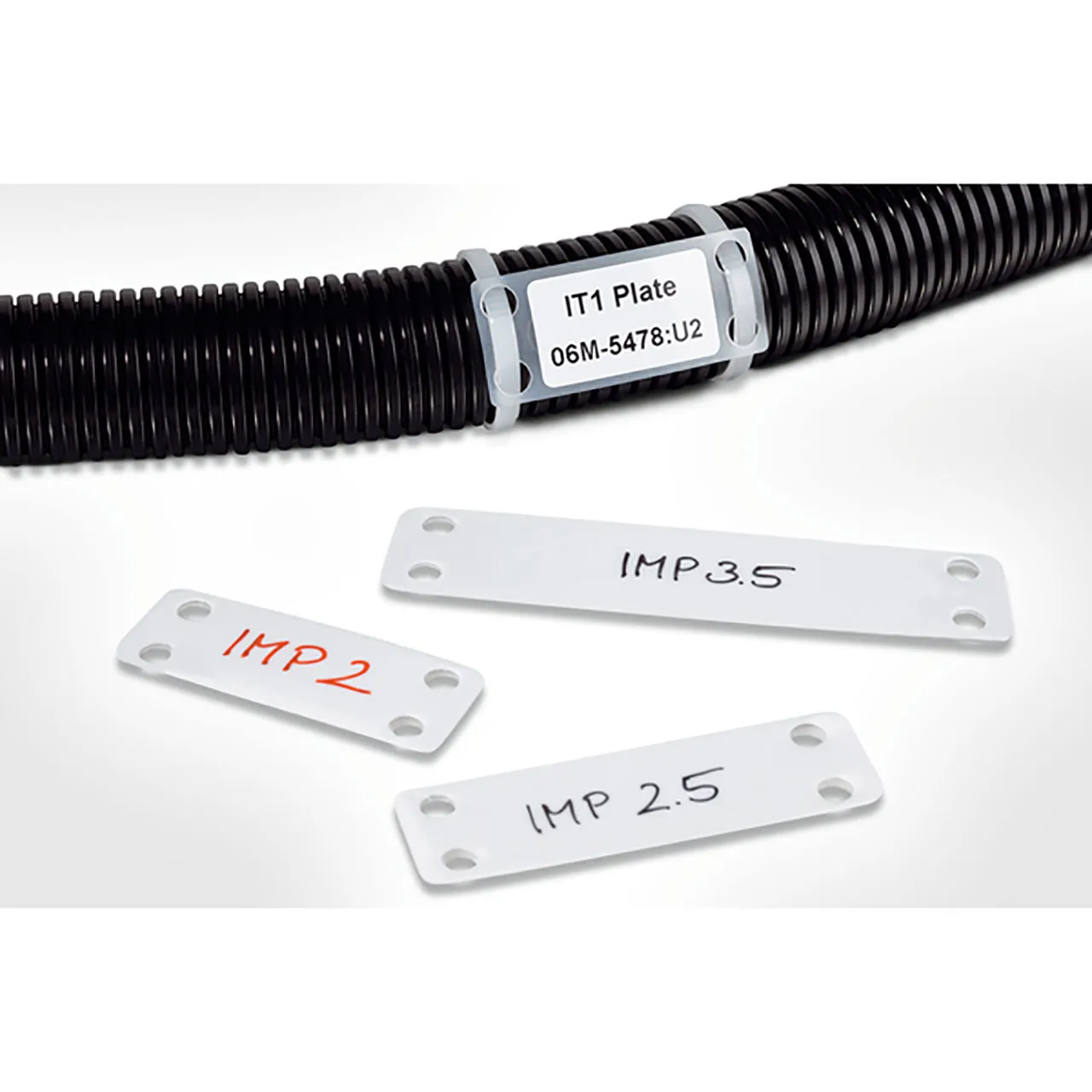 - Identification Marker Plates can be marked with a permanent pen, printed labels or hot stamped for a wide variety of labeling options. Any size bundle diameter can be marked because it is only dependent upon the length of the cable tie selected, provided the cable tie width does not exceed .29". The marker plates are stamped from nylon, making them a durable and long term method of identification. The mounting holes are positioned to allow the marker to be mounted as a flag, tag or wrapped around the cable or bundle for a wide variety of installed positions.