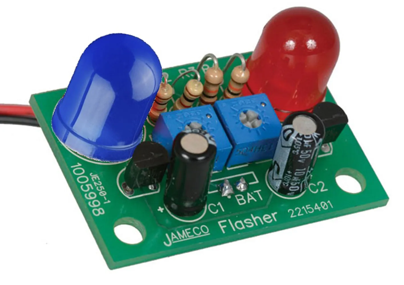 This is the PCB/solder version of the Jumbo Dual LED Emergency Flasher kit. We also offer a breadboard-friendly Jumbo LED Flasher kit (P/N: 2246637). This is an easy to assemble solder kit that is great for beginners or someone looking to add a flashing signal to their scale model projects, and this kit in particular is ideal if your scale model is an emergency vehicle because of the flashing red and blue LEDs. You can also use different color LEDs of your choice (sold separately). The flashing rate is adjustable with the two trimmer potentiometers.Note: Due to internal packaging met