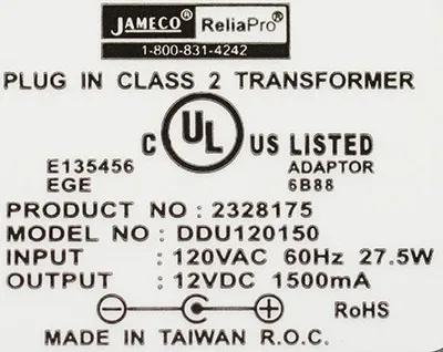 Linear Wall Adapter 12 Volt 1500mA 18 Watt 2.1mm Plug Center Positive