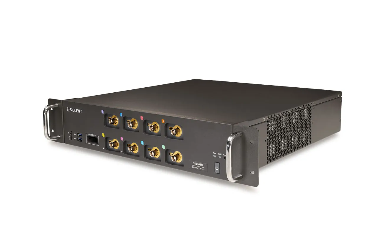 SIGLENT's SDS6000L series Low Profile Digital Storage Oscilloscopes provide up to 8 analog channels (up to 512 Channels) + 16 digital channels (up to 1024 Channel) in a space-saving chassis size. The bandwidth is 500 MHz, features a maximum sample rate of 5 GSa/s (10 GSa/s ESR) for each channel, and a maximum record length of 500 Mpts/ch.