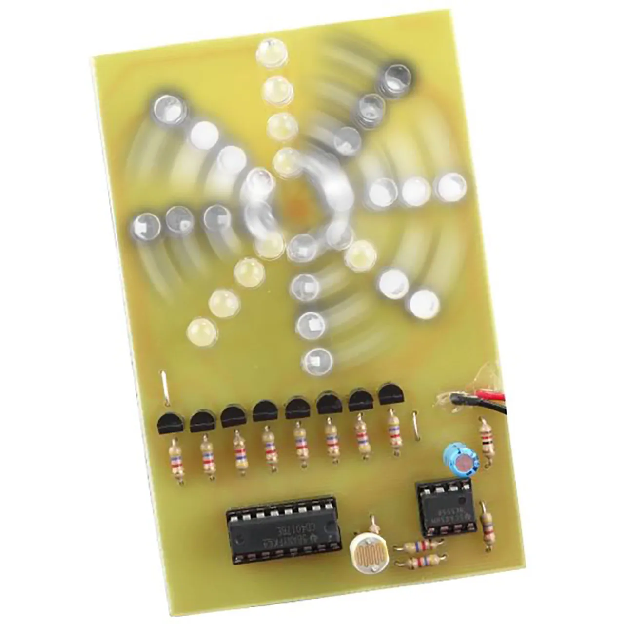 This kit produces sweeping white light bars that magically speed up or down depending on the ambient light level. In darkness, the bars (made up of 4 bright clear lens LEDs each) rotate very slowly, then as the ambient light increases the sweeping increases and takes on a radar screen appearance. If the ambient light is very bright the sweeping speed is so rapid that the kit appears to shimmer. This kit produces these effects automatically and makes a great attention getting display. Size of board: 2.6" x 4.1". Operates from one 9V battery (not included). Complete with all parts, PC board and instructions. Skill Level 2.