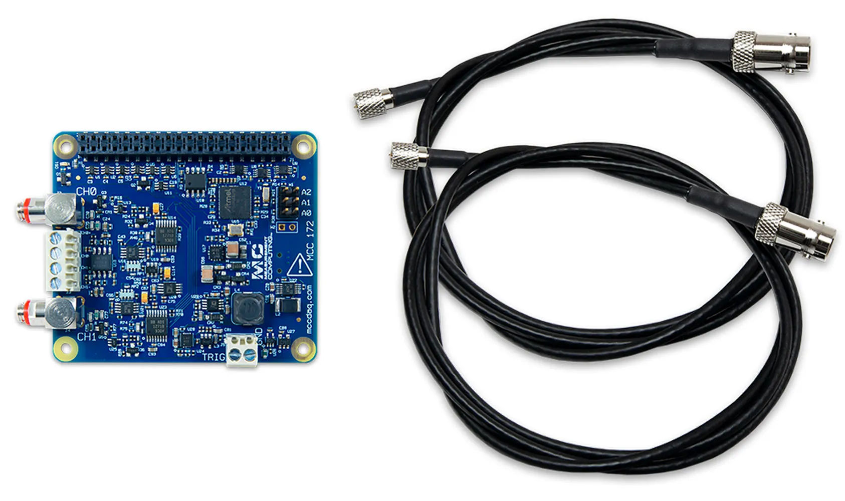 - MCC 172 DAQ HAT bundled with two coaxial cables (3 ft, with 10-32 plug to BNC jack)