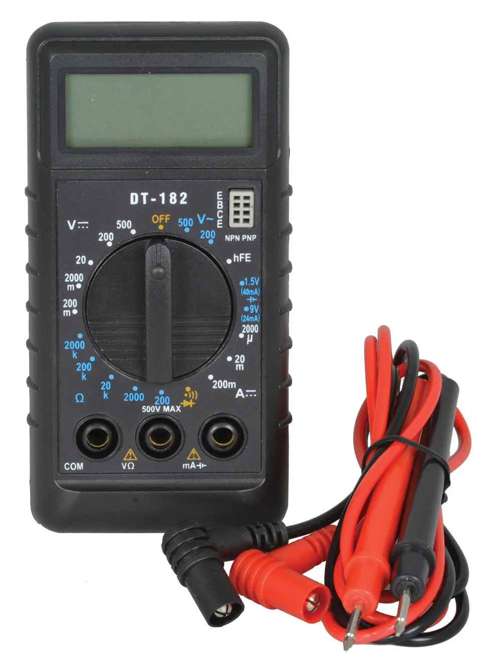 This pocket-sized digital multimeter can be taken anywhere and is a must have for any technicians toolbox. The DT-182 handheld digital multimeter is an ideal low-cost multi-function tester for DC voltage, AC voltage, DC current, resistance, and has diode, transistor, continuity and battery test functions. It is powered by a 12V (23A style) battery.