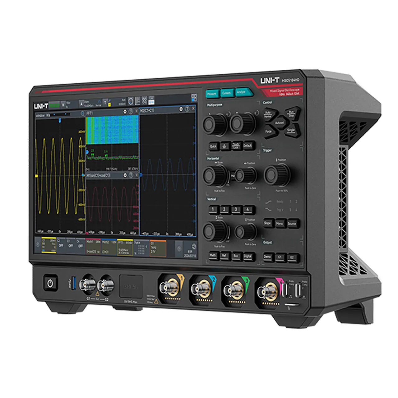 A 12-Bit, Nine-in-One Benchtop powerhouse. The UNI-T MSO5034HD offers one instrument that can be a 350MHz, 4Ch High-Definition Digital Oscilloscope, Logic Analyzer, Function/Arbitrary Waveform Generator, Spectrum Analyzer, Digital Voltmeter, High-Precision Frequency Counter, Protocol Analyzer, Bode Plot Analyzer, and Power Analyzer. All with up to 5 years warranty.