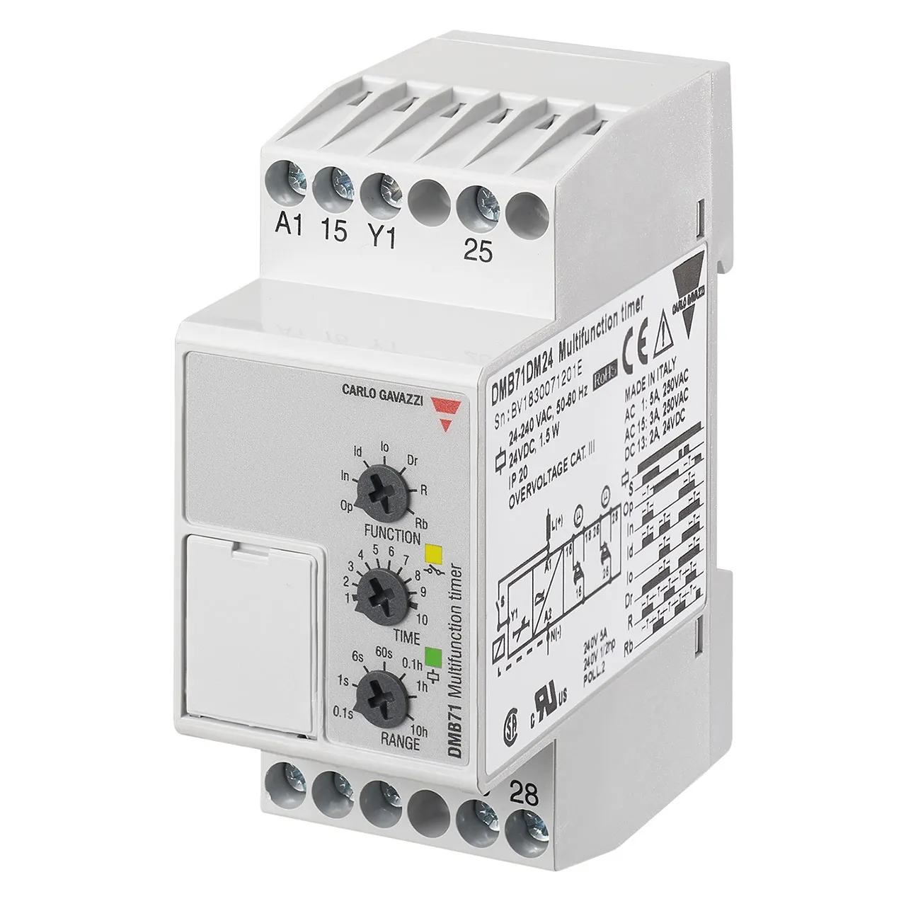 Multifunctions Timer DIN rail mount 35,5x81x67,2mm housing knob selectable function selectable time ranges 0,1s - 100h Supply voltage 12-240Vac/Vdc Screw terminals connection 5A DPDT relay output