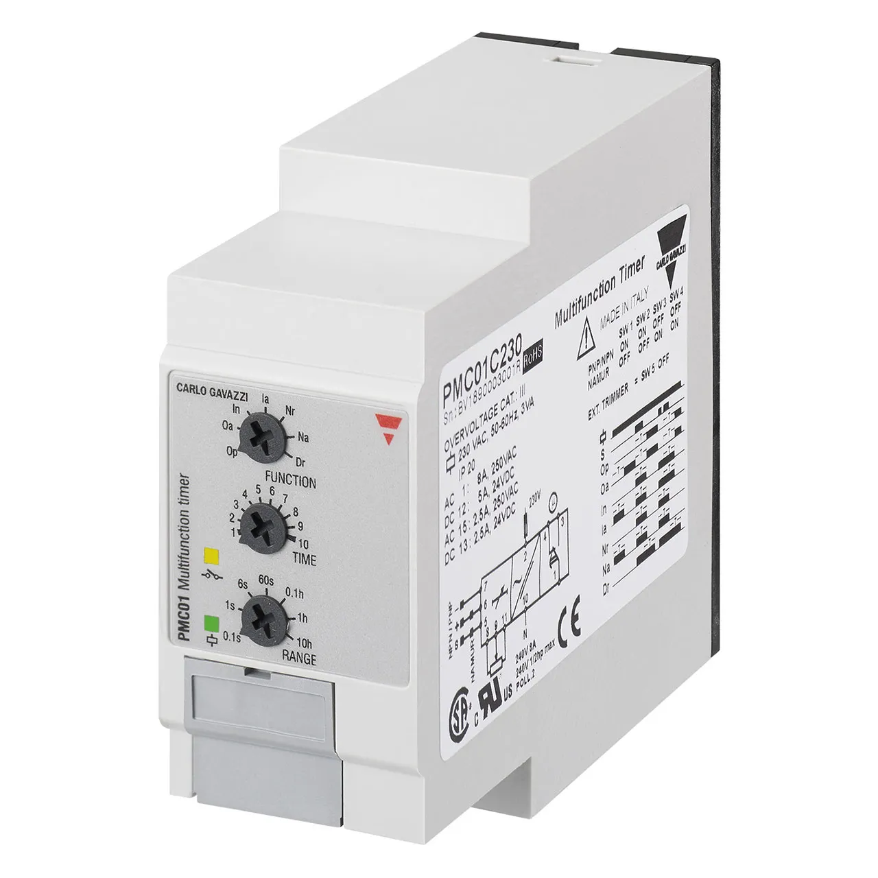 Multifunctions Timer, Plug-in Socket mount, 36x80x94mm Euronorm housing, knob selectable function, selectable time ranges 0,1s - 100h, Supply voltage 24-240Vac/Vdc, 8A DPDT relay output.