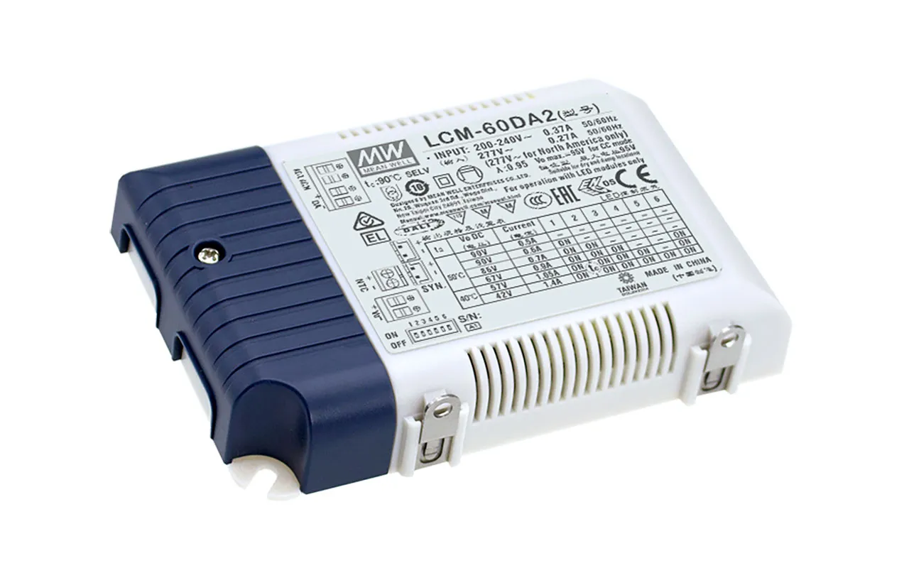The LCM-60DA series is a 60W AC/DC constant current mode output LED driver featuring multiple levels selectable by a dip switch and the DALI interface with compliance to IEC62386. The LCM-60DA operates from 180-295VAC and offers different current levels ranging between 500mA and 1400mA. Thanks to the efficiency up to 92%, with the fanless design, then entire series can operate with -30C to 90C case temperature under free air convection. In addition, LCM-60DA is equipped with push dimming and synchronization functions, so as to provide the optimal design flexibility for LED lighting systems.