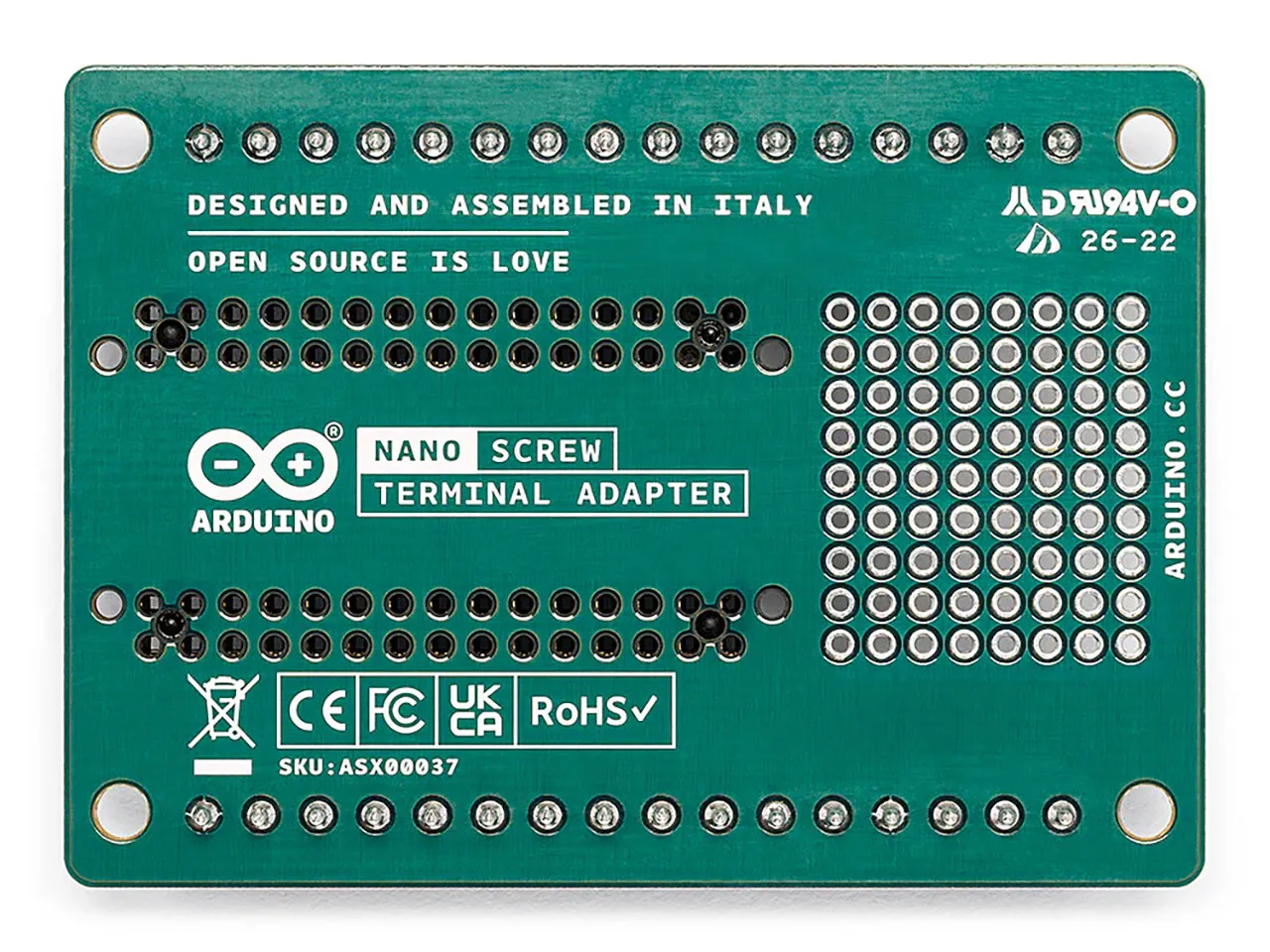 Build robust projects with secure and long-lasting connection without the need of any soldering combining the Nano Screw Terminal Adapter and any of the boards from the Arduino Nano family. Build Arduino Nano board based projects with secure connections using screw terminals and in case you need to add some extra components, you can use the prototyping area.