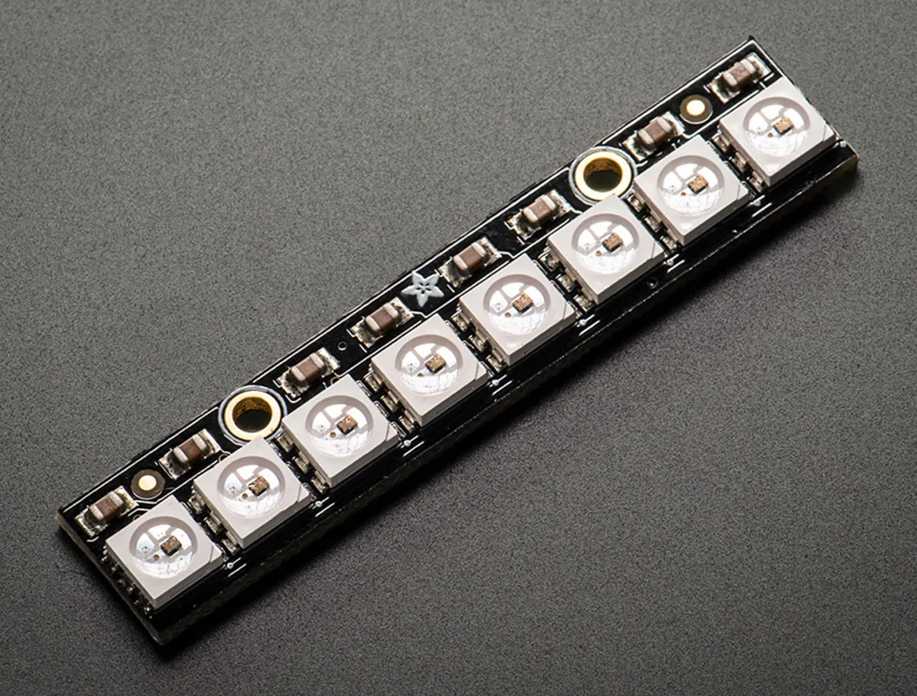 Make your own little LED strip arrangement with this stick of NeoPixel LEDs. Adafruit crammed 8 of the tiny 5050 (5mm x 5mm) smart RGB LEDs onto a PCB with mounting holes and a chainable design. Use only one microcontroller pin to control as many as you can chain together! Each LED is addressable as the driver chip is inside the LED. Each one has about 18mA constant current drive, so the color will be very consistent even if the voltage varies, and no external choke resistors are required making the design slim. Power the whole thing with 5VDC (4-7V works) and you're ready to rock.The LEDs are 'chainable' by connecting the output of one stick into the input of another - see the photo above. There is a single data line with a very timing-specific protocol. Since the protocol is very sensitive to timing, it requires a real-time microcontroller such as an AVR, Arduino, PIC, mbed, etc. It cannot be used with a Linux-based microcomputer or interpreted microcontroller such as the netduino or Basic Stamp. Our wonderfully-written Neopixel library for Arduino supports these pixels! As it requires hand-tuned assembly it is only for AVR cores but others may have ported this chip driver code so please google around. An 8MHz or faster processor is required.