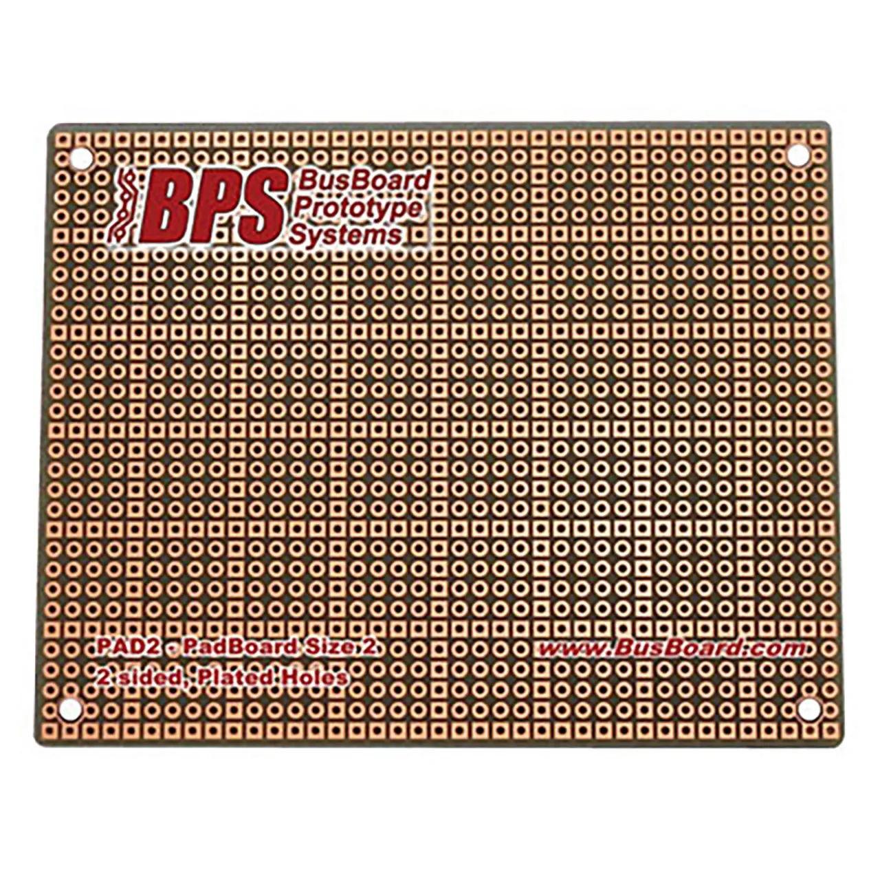 PAD2 PadBoard-Size2, Pad-per-Hole, Plated holes, Square Locator HolesThe PadBoard-2 prototyping circuit board has a general-purpose pad-per-hole pattern which is good for analog and digital use. It is a double-sided board with plated holes, which allows components to be soldered to either side of the board. A square pad is provided every 5th hole, which makes it easy to align components on the top and bottom of the board.