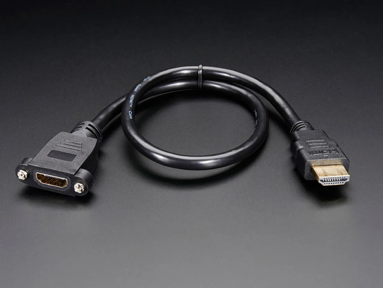 This panel mount extension cable will allow you to extend an HDMI connection and secure it to an enclosure. Perfect for placing your Raspberry Pi in a secure box. Two #4-40 screws are used to attach the female socket end, 26.9mm apart. Two hex-body standoff-screws are included as shown above and the hex nuts are embedded inside the molded end.