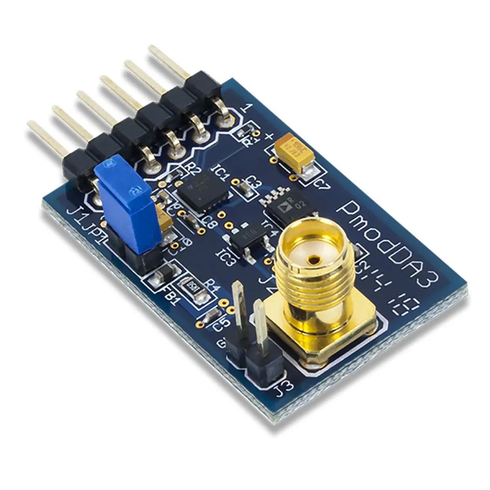 The Pmod DA3 is a 16-bit Digital-to-Analog converter powered by the Analog Devices AD5541A. The single-ended SMA output provides a clean, guaranteed monotonic analog output from the provided information given via an interface like SPI.Features