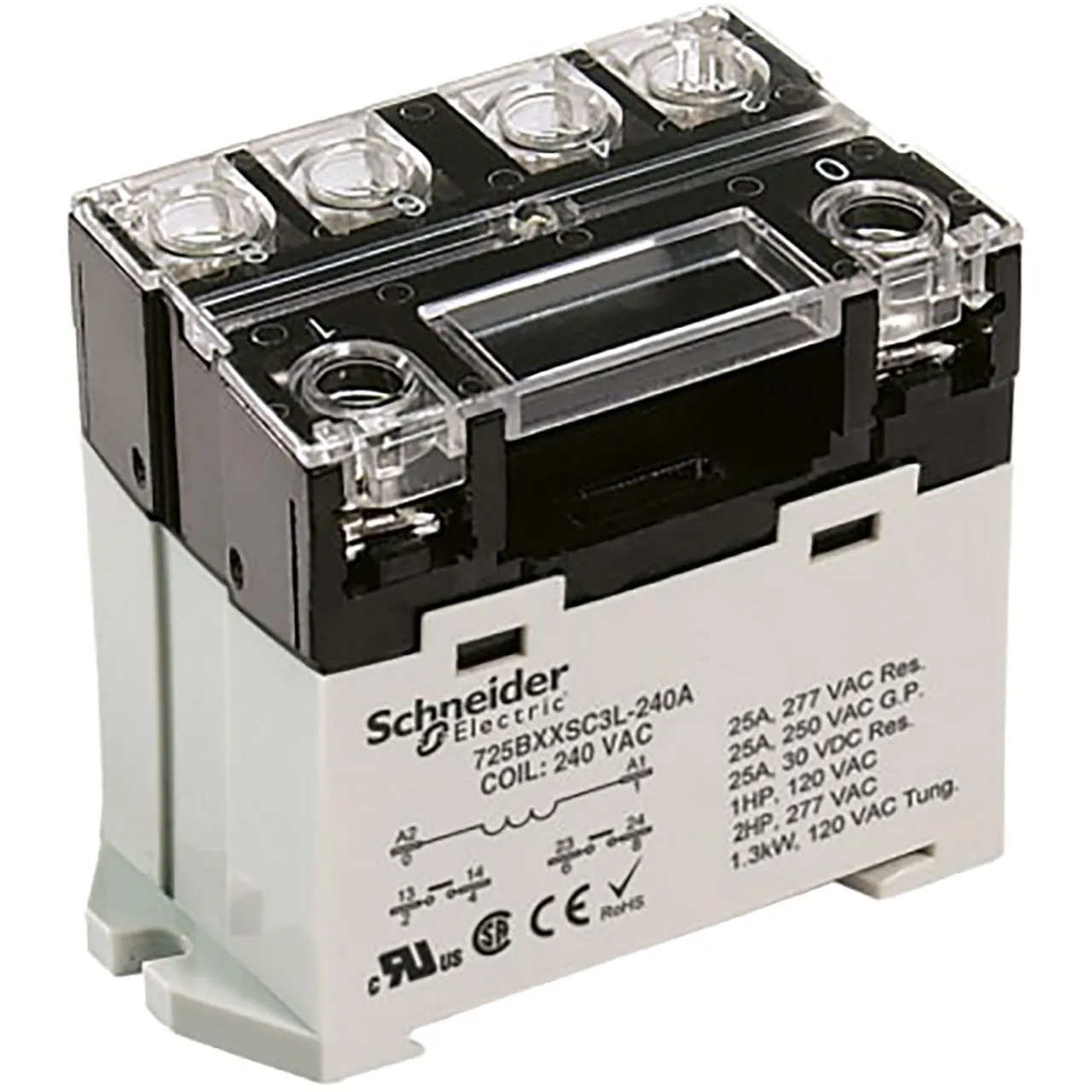 Power Relay, Electromechanical, 24VAC, 25A, DPST-NO, DIN Rail/Panel Mount, 725 Series.