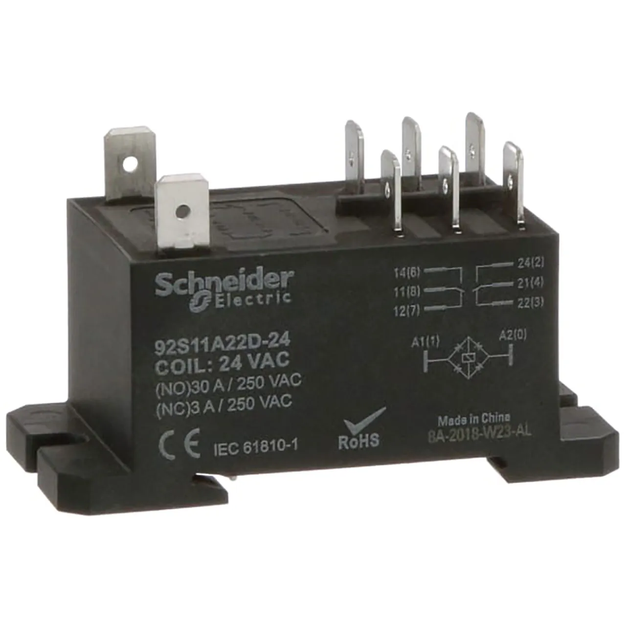 Power Relay, Electromechanical, General Purpose, 24VAC, 30A-NO, DPDT, QC Terminals, Panel Mount, 92S Series.