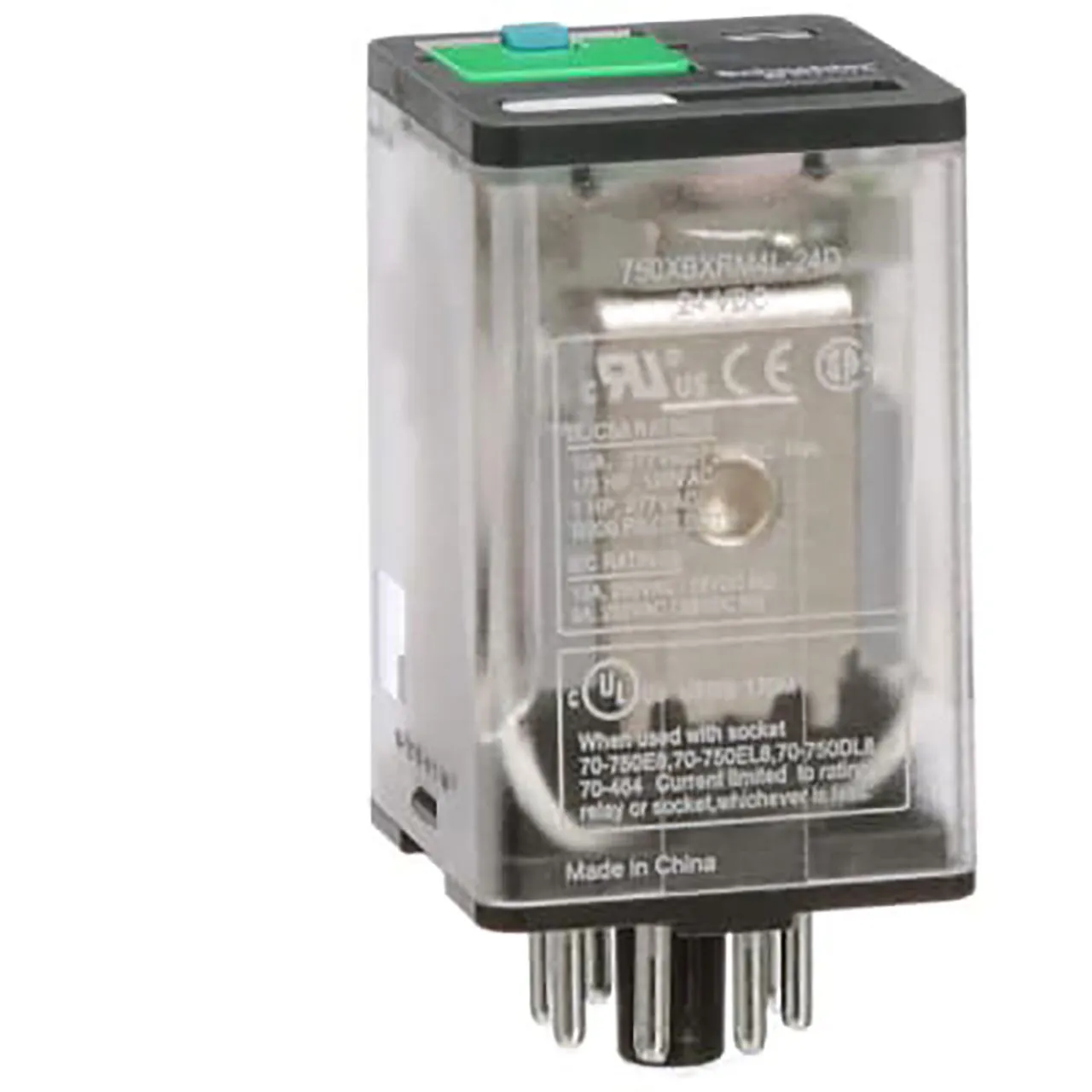 Power Relay, Electromechanical, General Purpose, 24VDC, 10A, DPDT, 250VAC Contact Rating, 8 Pin Octal Plug-in, LED Test Light, 750 Series.