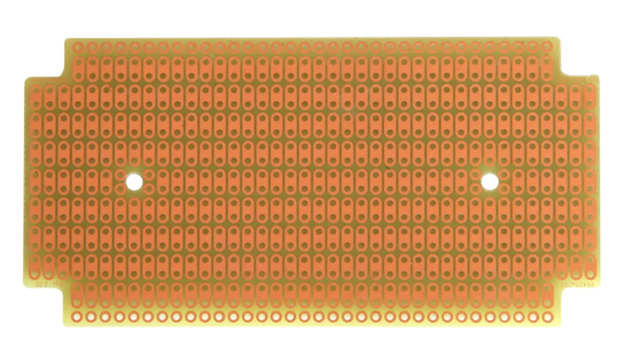The PR1590B is a prototyping circuit board (PCB) designed to fit the Hammond 1590B die-cast aluminum enclosure. It has the convenient 2-hole ProtoBoard pattern, which provides an easy way to connect parts while maximizing usable board area. It can be used as a stand-alone prototyping board, or installed in a Hammond 1590B enclosure.Features