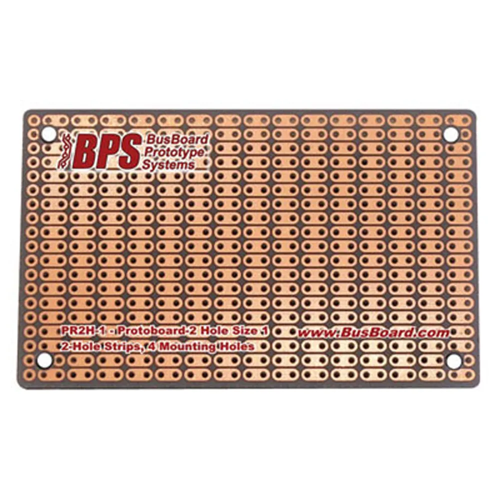 PR2H1 ProtoBoard-2H Size1, 2-Hole Strips, 4 Mounting HolesThe convenient 2-hole ProtoBoard pattern provides an easy way to connect parts while maximizing usable board area. ProtoBoard-2H is a good pattern for compact circuit layouts, and it is often more convenient than pad-per-hole patterns. It is good for analog use as well as digital since many discrete components can be located closely. It is a single-sided board with holes on 0.1" centers. An anti-tarnish coating protects the copper for a long shelf-life and provides easy soldering.