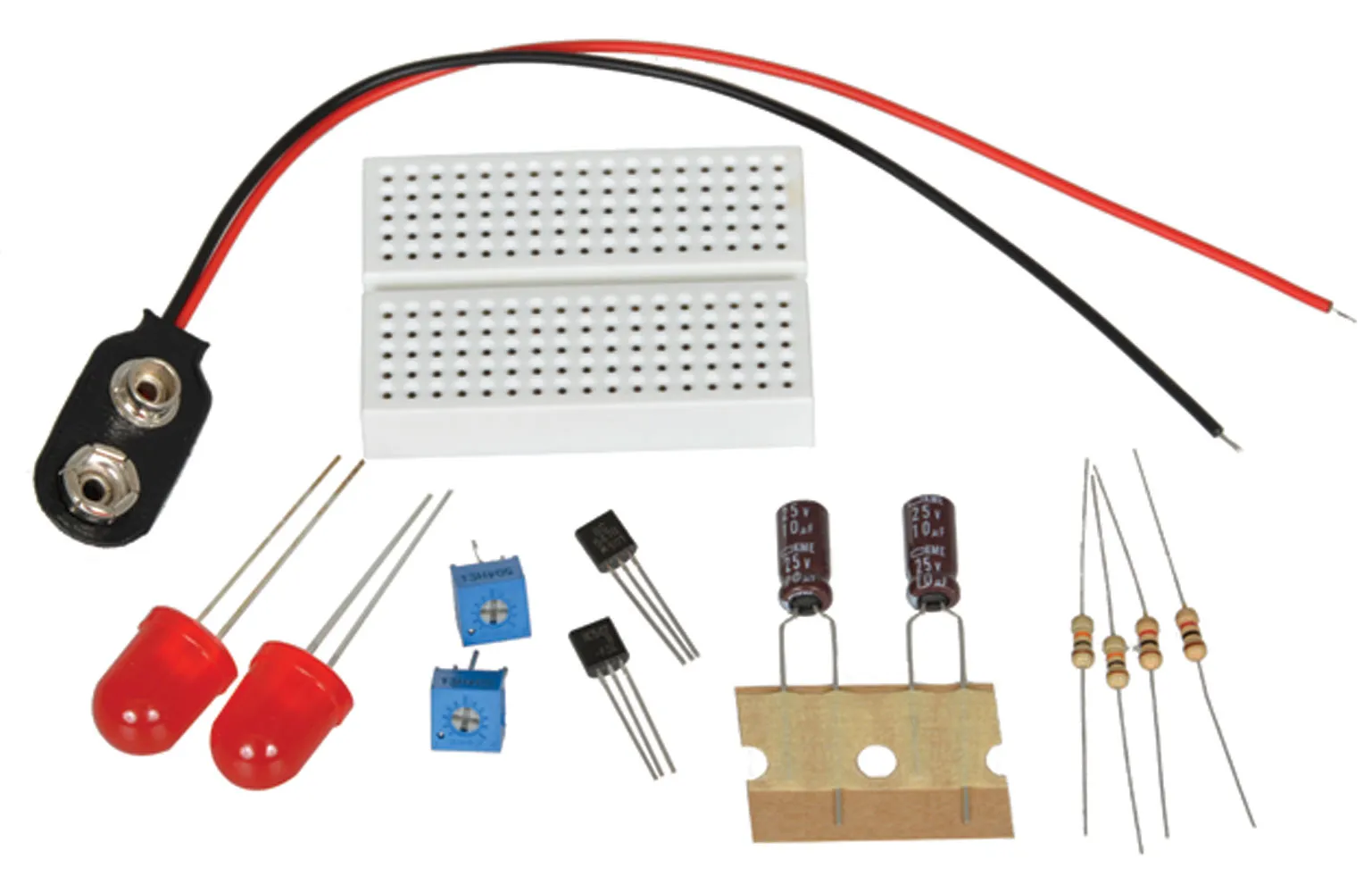 This is the solder-free, breadboard-friendly version of the Jumbo LED Flasher solder kit. This kit is great for beginners to electronics and those who may not be ready to solder but are still interested in assembling an electronic circuit that actually does something when complete. You can also pick up other LEDs to make yours a different color. The flashing rate is adjustable with the two trimmer potentiometers.This kit is now available in other colors: Orange, Yellow, Green, Blue, and Red/Blue Emergency Combo.