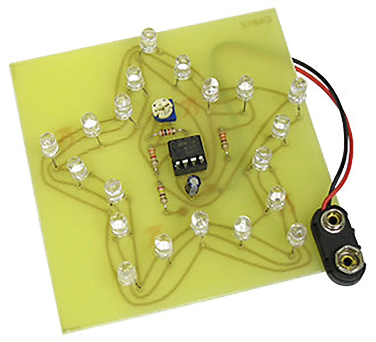 Strobing Red White and Blue LEDs on this 3" star produce a blinding bright flashing display. Uses one IC circuit with 20 brilliant LEDs and an adjustable control for flashing speed. The star can be seen from great distances and is very eye catching. Operates from one 9V battery (not included). Size of PC board is 3.52" sq. Complete with all parts, PC board and instructions. This kit requires soldering of components to the PC board while building. Skill Level 2.